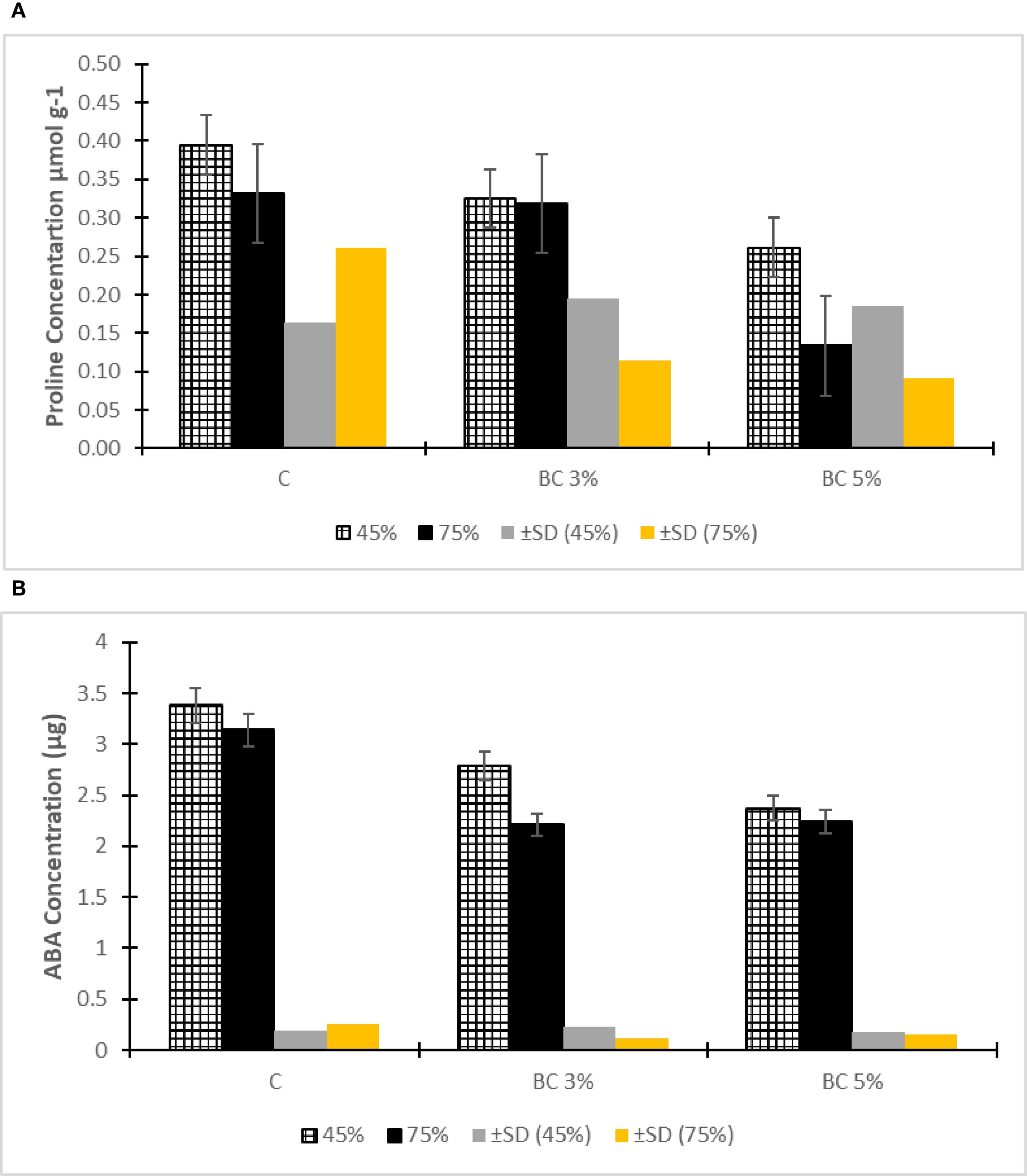 These findings align with established mechanisms where biochar amendments moderate drought-induced hormonal responses (Chen et al., 2023), while the proline reduction correlates with observed improvements in membrane stability and photosynthetic efficiency (Munemasa et al., 2015). The consistent performance of 5% biochar across both stress markers underscores its optimal concentration under the tested conditions for physiological stress mitigation.