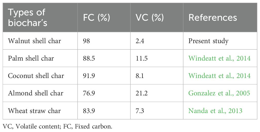 It’s necessary to develop farming practices that increase soil fertility and minimize need of synthetic chemicals and innovative approach for instance climate-smart agriculture (CSA), these are the solutions to increase food production with less impact on the environment. A possible solution is to utilize biochar made from agricultural waste (Jatuwong et al., 2025; Food and Agriculture Organization of the United Nations, 2013). For variety of crops, biochar has been shown to increase plant growth and development, water-holding and -use capacity, and stress tolerance due to its porous in nature, large surface area, and potential to improve soil-water retention and nutrient accessibility (Taghizadeh-Toosi et al., 2012; Jing et al., 2020; Ma et al., 2024). Biochar is mostly made from the breakdown of organic biowaste at temperatures between 400 and 700°C and act as a crop supplement to provide crop resistance against drought (Chowdhury et al., 2024). Previous research has shown that biochar improves soil water-holding capacity by up to 20% and enhances root development and microbial activity (Jeffery et al., 2011). For this concern utilizing WSs as a biomass feedstock for carbon production not only promotes efficient resource utilization but also helps lower the production cost of activated carbon (AC). Therefore, WSs offer considerable potential as a promising carbon-rich biomass material for industrial applications (Liu and Zhang, 2023). A carbon-rich byproduct of biomass pyrolysis, WS biochar, in particular, offers unique benefits due to its high fixed carbon content, low ash content, hard porous structure, high lignin content, large surface area, and cost-effectiveness making it an excellent soil amendment (Waqas et al., 2018). During 2022–2023, Pakistan cultivated 1,721 hectares of walnut, and the walnut fruit production was recorded at 15,026 tonnes (GoP 2024). The substantial production of walnuts has generated a significant volume of WSs as a by-product. However, the current reuse and recycling of WSs remains minimal, leading to considerable resource wastage.