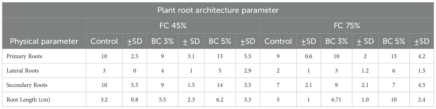 These findings align with previous research highlighting biochar’s role in enhancing plant growth and productivity under water-limited conditions (Akhtar et al., 2014). Maintaining a high-water status via growing roots, which increase a plant’s ability to absorb water is one of the processes by which plants respond to drought stress (Suryanti et al., 2023). When 3% and 5% biochar concentrations are compared under different FC (45% & 75%), the 5% biochar treatment at 75% FC resulted in more favorable improvement in root growth. Interestingly for both FC levels the average primary, lateral and secondary root growth was nearly the same between 3% and 5% biochar treatment. The addition of biochar provides favorable conditions for plant root growth and improve plant biomass, root length and root number (Sun et al., 2017). They also revealed that 5% biochar rate had produced a more extensive root system (thicker, longer root system). More number of secondary and tertiary roots were produced over a three-day watering interval. During drought stress plant roots produce additional secondary roots which increase their capacity to absorb water. This is a morphological adaptation that plants make in response to drought stress to ensure their survival (Suryanti et al., 2023).