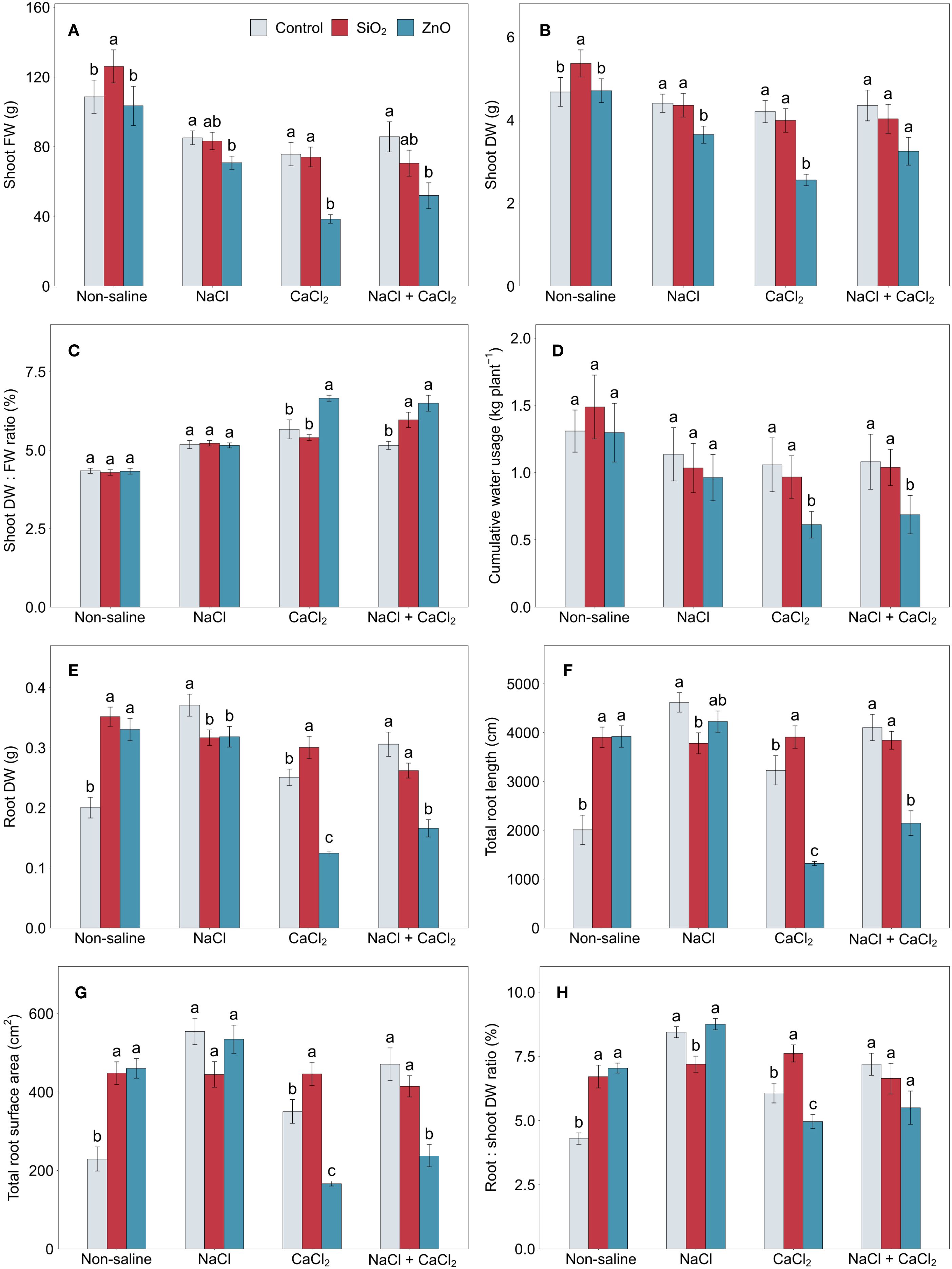 Figure 1. (A) shoot FW, (B) shoot DW, (C) shoot DW: FW ratio, (D) cumulative water usage, (E) root DW, (F) total root length, (G) total root surface area, and (H) root:shoot DW ratio in lettuce treated with nanoparticles under salinity stress. Different letters above the bars indicate statistically significant differences between nanoparticle treatments (control, SiO2, and ZnO) within each salinity stress (non-saline, NaCl, CaCl2, and NaCl + CaCl2) at P ≤ 0.05. Treatments sharing the same letter are not significantly different. Error bars indicate the standard error of the mean. FW, fresh weight; DW, dry weight.