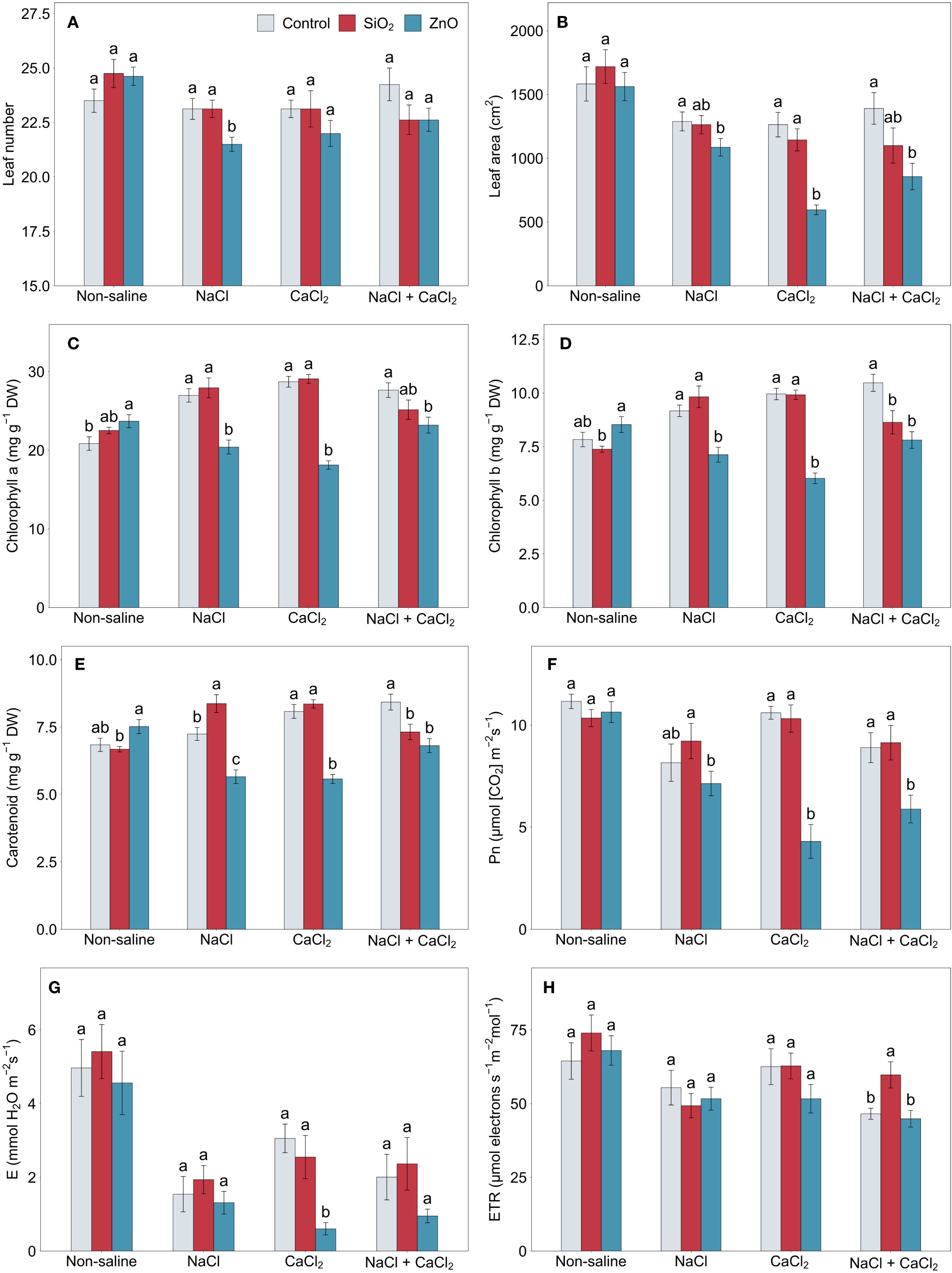 Figure 2. (A) leaf number, (B) leaf area, (C) chlorophyll a, (D) chlorophyll b, (E) carotenoid, (F) net photosynthetic rate, (G) transpiration rate, and (H) electron transport rate in lettuce treated with nanoparticles under salinity stress. Different letters above the bars indicate statistically significant differences between nanoparticle treatments (control, SiO2, and ZnO) within each salinity stress (non-saline, NaCl, CaCl2, and NaCl + CaCl2) at P ≤ 0.05. Treatments sharing the same letter are not significantly different. Error bars indicate the standard error of the mean; Pn, net photosynthetic rate. E, transpiration rate; ETR, electron transport rate.