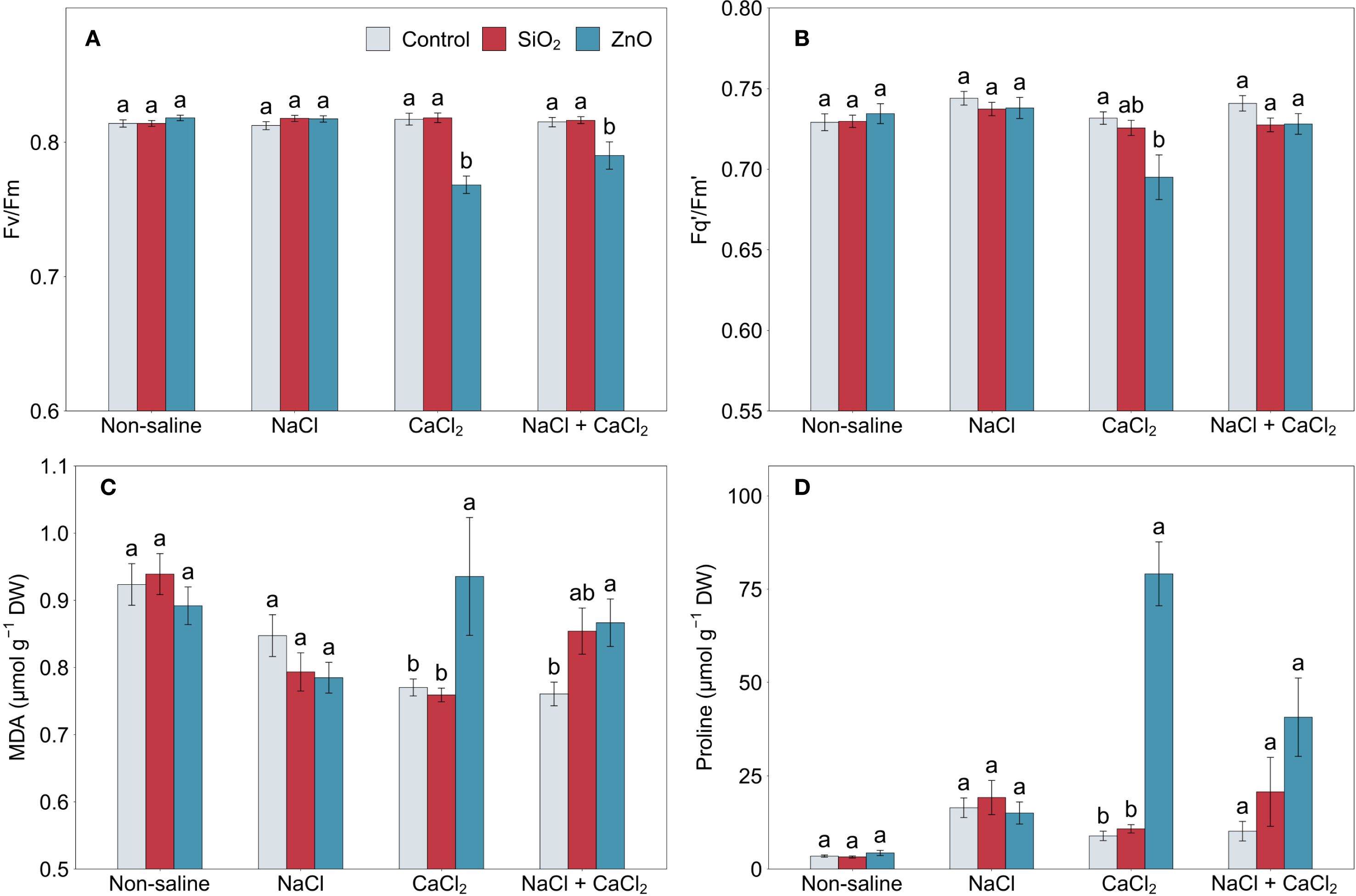 Figure 3. (A) Fv/Fm, (B) Fq’/Fm’, (C) MDA, and (D) proline in lettuce treated with nanoparticles under salinity stress. Different letters above the bars indicate statistically significant differences between nanoparticle treatments (control, SiO2, and ZnO) within each salinity stress (non-saline, NaCl, CaCl2, and NaCl + CaCl2) at P ≤ 0.05. Treatments sharing the same letter are not significantly different. Error bars indicate the standard error of the mean. MDA, malondialdehyde.