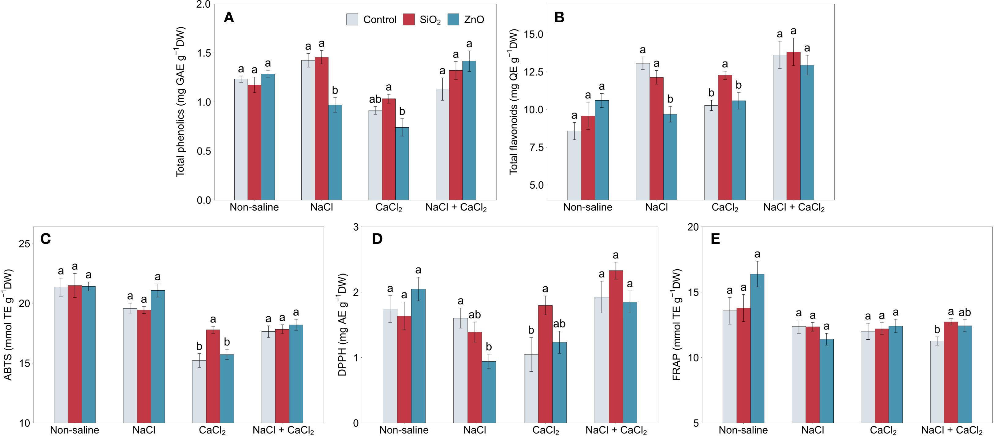 Figure 4. (A) total phenolics, (B) total flavonoids, (C) ABTS, (D) DPPH, and (E) FRAP in lettuce treated with nanoparticles under salinity stress. Different letters above the bars indicate statistically significant differences between nanoparticle treatments (control, SiO2, and ZnO) within each salinity stress (non-saline, NaCl, CaCl2, and NaCl + CaCl2) at P ≤ 0.05. Treatments sharing the same letter are not significantly different. Error bars indicate the standard error of the mean.