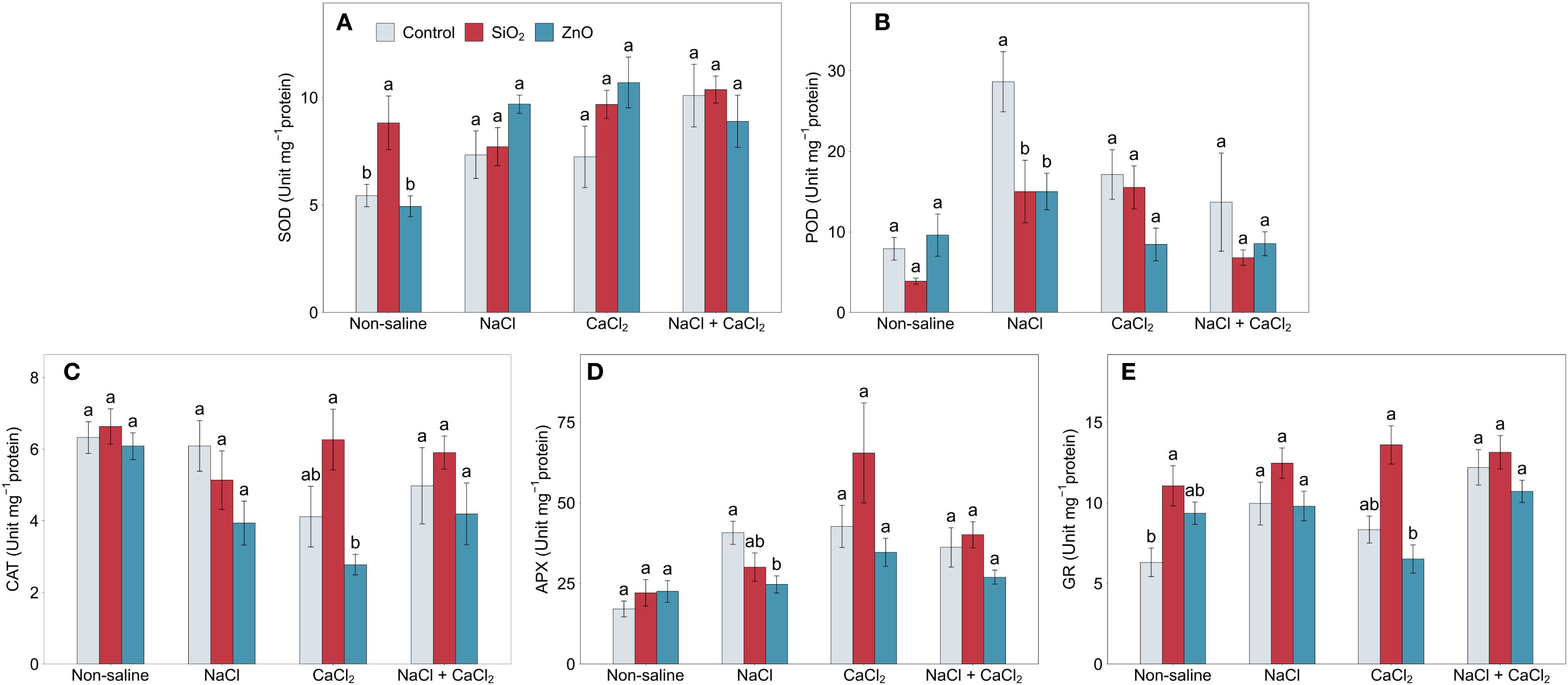 Figure 5. (A) SOD, (B) POD, (C) CAT, (D) APX, and (E) GR activities in lettuce treated with nanoparticles under salinity stress. Different letters above the bars indicate statistically significant differences between nanoparticle treatments (control, SiO2, and ZnO) within each salinity stress (non-saline, NaCl, CaCl2, and NaCl + CaCl2) at P ≤ 0.05. Treatments sharing the same letter are not significantly different. Error bars indicate the standard error of the mean. SOD, superoxide dismutase; POD, guaiacol peroxidase; CAT, catalase; APX, ascorbate peroxidase; GR, glutathione reductase.