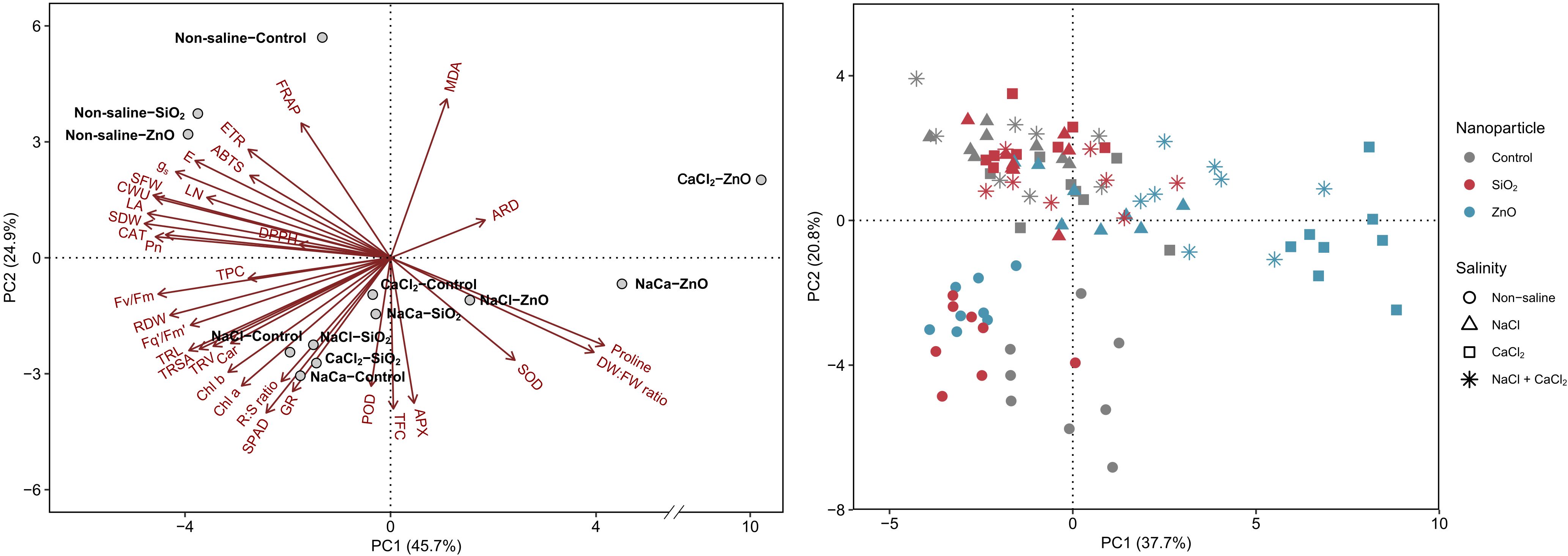 Two principal component analysis (PCA) graphs showing variables and their distribution based on salinity and nanoparticle treatments. The left graph features vectors representing different biochemical and physiological factors with data points indicating salinity-nanoparticle treatment groups. The right graph shows a scatter plot where data points are color-coded by nanoparticles (Control, SiOâ‚‚, ZnO) and shaped by salinity type (Non-saline, NaCl, CaClâ‚‚, NaCl + CaClâ‚‚). The axes represent principal components one and two with their respective variance percentages.