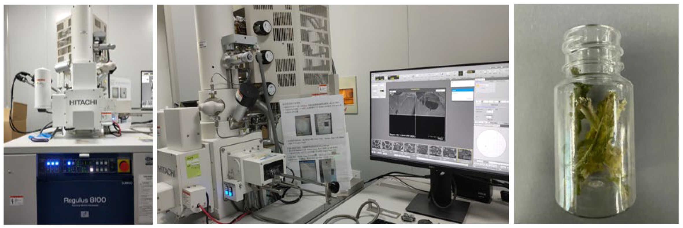The petiole can be regarded as a hierarchical structure with structural features defined at multiple scales. The petiole is typically composed of various cell tissues, and its mechanical properties mainly depend on the geometric shape, structural characteristics of the compositional components, and the microscopic structure of the tissues (Shah et al., 2017). To analyze the impact of the internal structure of the petiole on its mechanical properties, an electron microscope was used to observe the cross-sectional morphology of the petiole. The distribution of various cellular tissues, including the epidermis, collenchyma tissue, parenchyma tissue, and vascular tissue, was studied. (Langer et al., 2021; Faisal et al., 2013) The radish petiole was processed using a dehydration followed by liquid nitrogen quenching method to prepare the samples, which were then observed using the Regulus 8100 electron microscope (Hitachi High-Tech), as shown in Figure 3.
