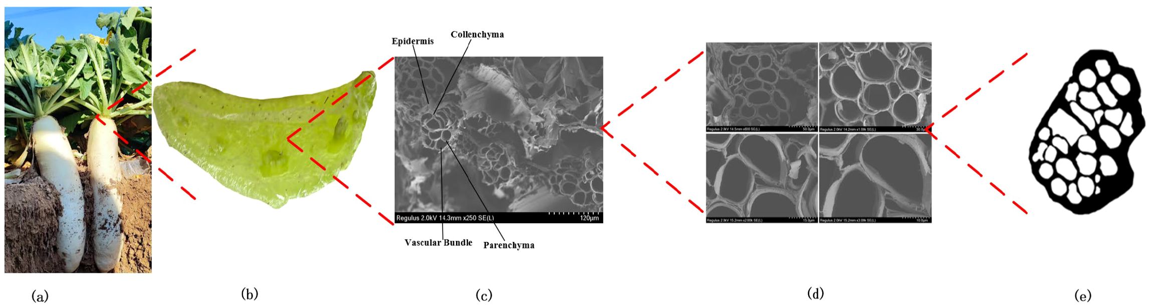 Figure 4. Hierarchical structure of the radish petiole. (a) Radish. (b) Petiole cross-section with multiple tissue. (c) Tissue microstructure. (d) The microstructural morphology of petiole cross sections at different magnifications. (e) The cross-section after morphological processing.