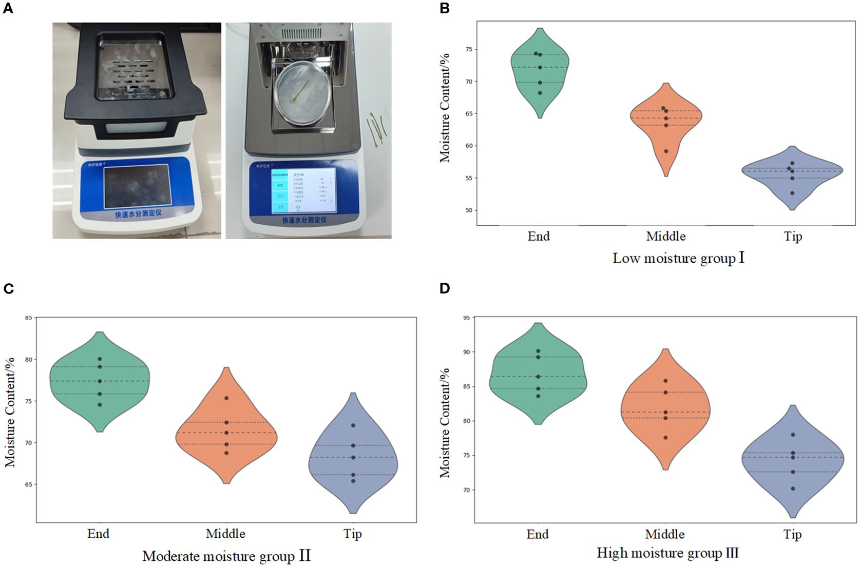 Samples from the distal, middle, and apical regions of the petioles were selected from groups I, II, and III, respectively. As shown in Figure 6A, after weighing the samples using a rapid moisture meter (Zhonghu Yixin Rapid Moisture Analyzer), they were subjected to a 20-minute drying process. The measurement results are presented in Figures 6B–D.