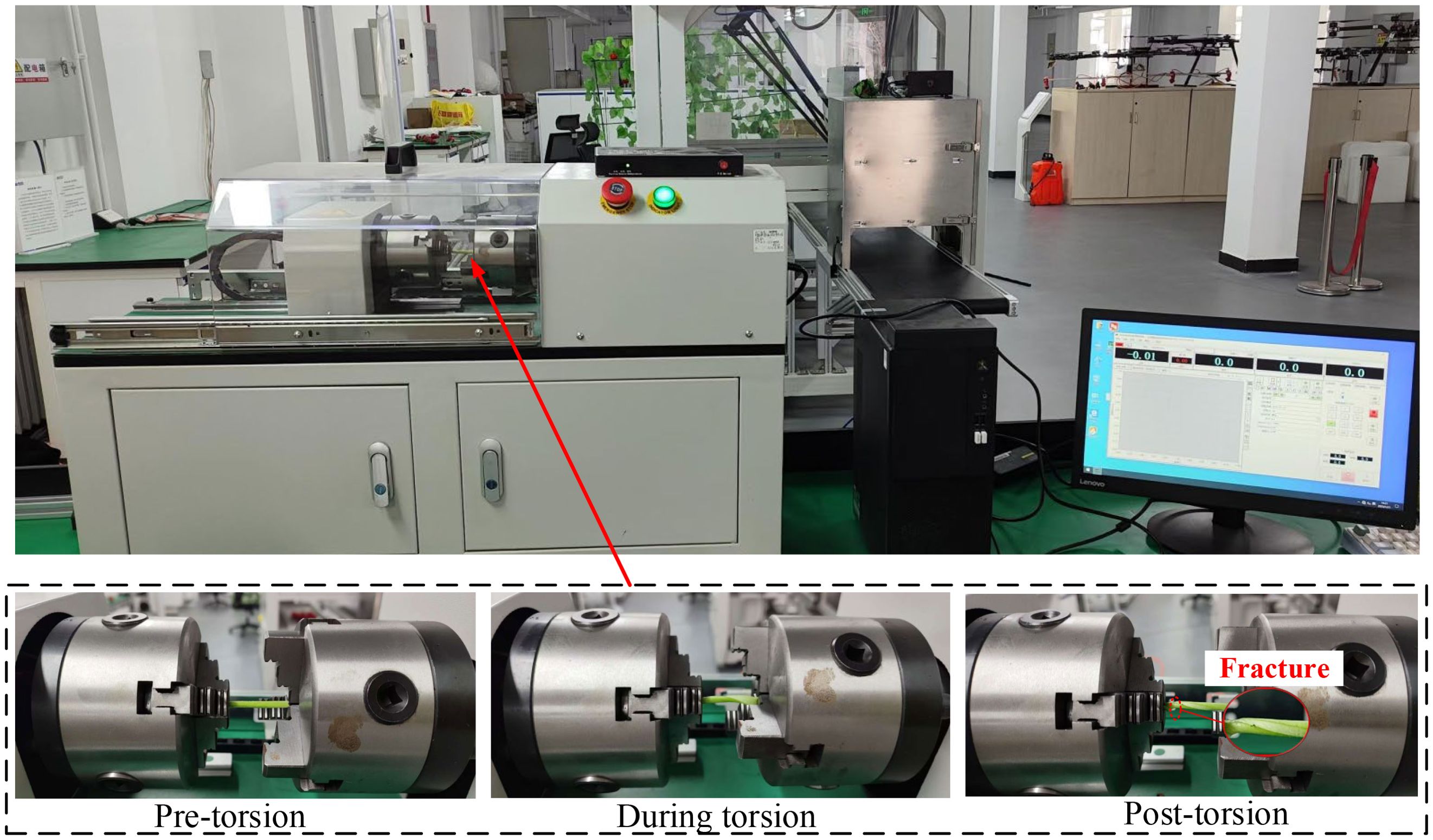 Torsional bending experiments were conducted to analyze the torsional fracture behavior of petioles at different regions and moisture contents, with the aim of determining the optimal clamping and extraction position, thereby laying the foundation for the subsequent development of a discrete element model for the petiole. Considering the practical operating conditions where the clamping pulleys rotate in opposite directions, generating both left-handed and right-handed torques on the petiole, the torque experiments were conducted for both left-handed and right-handed rotation scenarios. During the clamping and extraction process of the radish petiole, torsional stress is induced by the gravitational force of the leaf and external loads. Typically, the distal end of the petiole is fixed to a shortened stem, which is considered as the fixed end. Therefore, in the torsion experiment, one end is fixed while torque is applied at the other end. The torsion testing machine model is LYWN-W5N (Jinan Lingyue Precision Instruments Co., Ltd.), with the control end set to a torsional angle of 360°/min. The torque-rotation angle curve is observed, and the torsional modulus of the petiole is analyzed. The sample tests and equipment are shown in Figure 7.