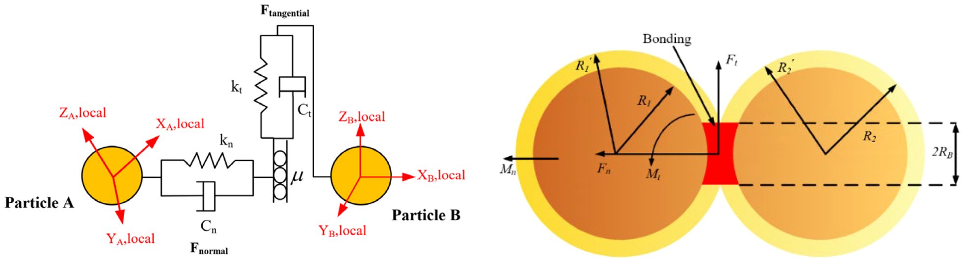 Where, A is the contact area (m2), St and Sn are the tangential and normal stiffness (N/m²), vt and vn are the tangential and normal velocities(m/s), and are the tangential and normal angular velocities(rad/s), is the simulation time step (s), is the contact radius of the BondingV2 (mm), and represent the forces in the normal and tangential directions generated by the bonding link(N), and represent the torques in the normal and tangential directions generated by the bonding (N·m).