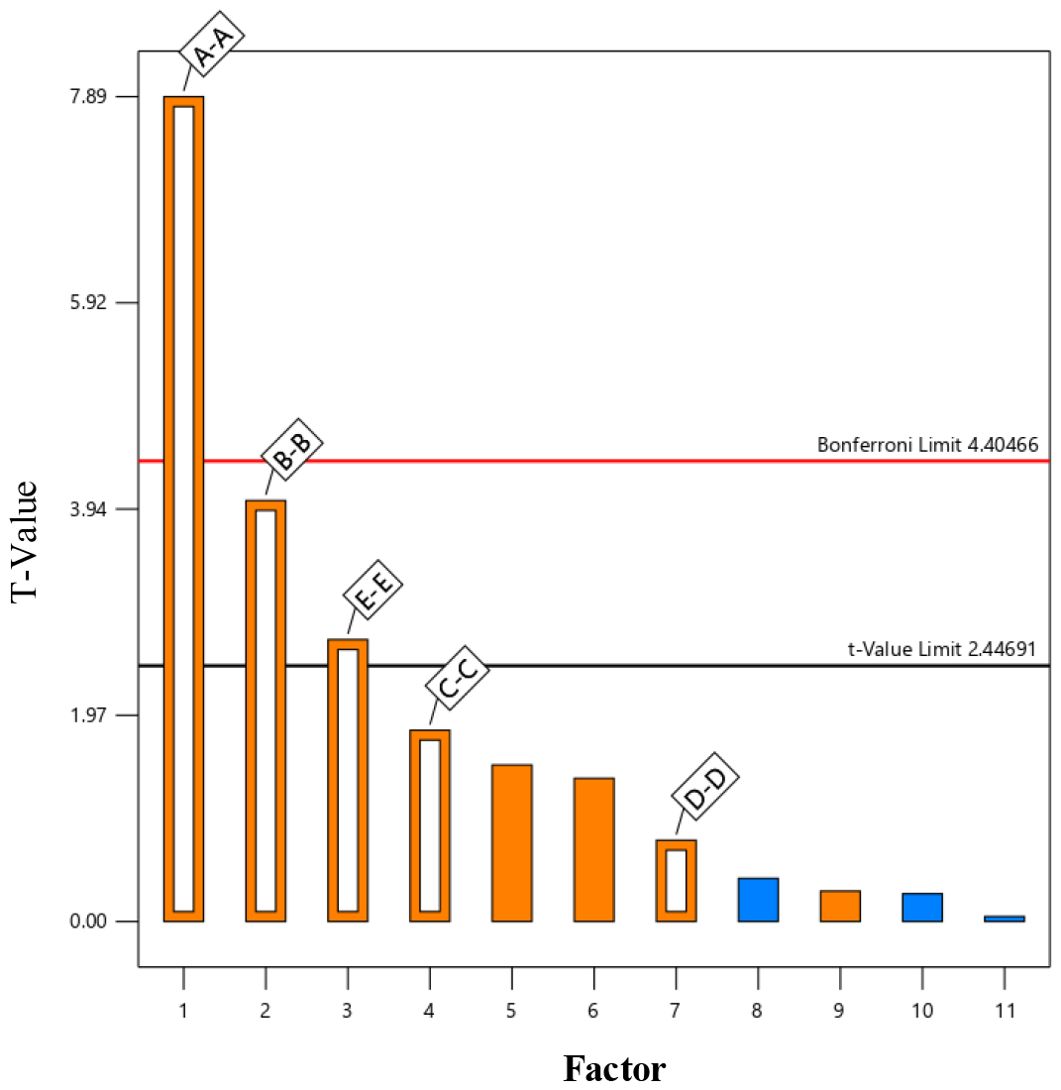 In this study, the Plackett-Burman module of Design-Expert software was employed to evaluate the effects of five factors on the three-point bending force (Fbe) using response values. Each factor was set at two levels (high and low), resulting in 12 experimental trials. The experimental design and results are shown in Table 4. A variance analysis was performed on the experimental data, and the Lenth method was applied to identify the significant effects in the Plackett-Burman experimental results. A Pareto chart of the standardized effects of the factors was generated, as depicted in Figure 13. The factors of normal stiffness per unit area (X1), shear stiffness per unit area (X2), and Bonded Disk Scale (X5) were found to have P-values less than 0.05, indicating their significant influence on the response. The significant factors affecting the angle of repose were determined to be normal stiffness per unit area (X1), shear stiffness per unit area (X2), and Bonded Disk Scale (X5).
