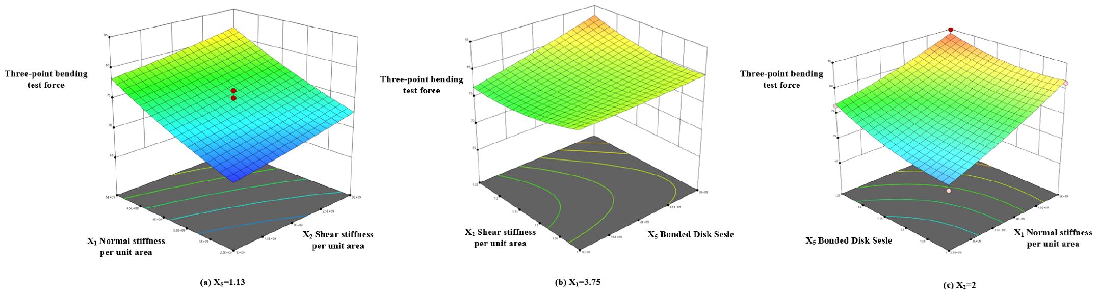 Based on the regression model in Equation 13, a response surface for the bonding parameters was constructed, as shown in Figure 14. The steepness of the response surface reflects the influence of interaction terms on the response value. The steeper the surface, the more significant the effect. The response surface plot shows that the three-point bending force increases gradually with the increase in factors X1, X2, and X5.