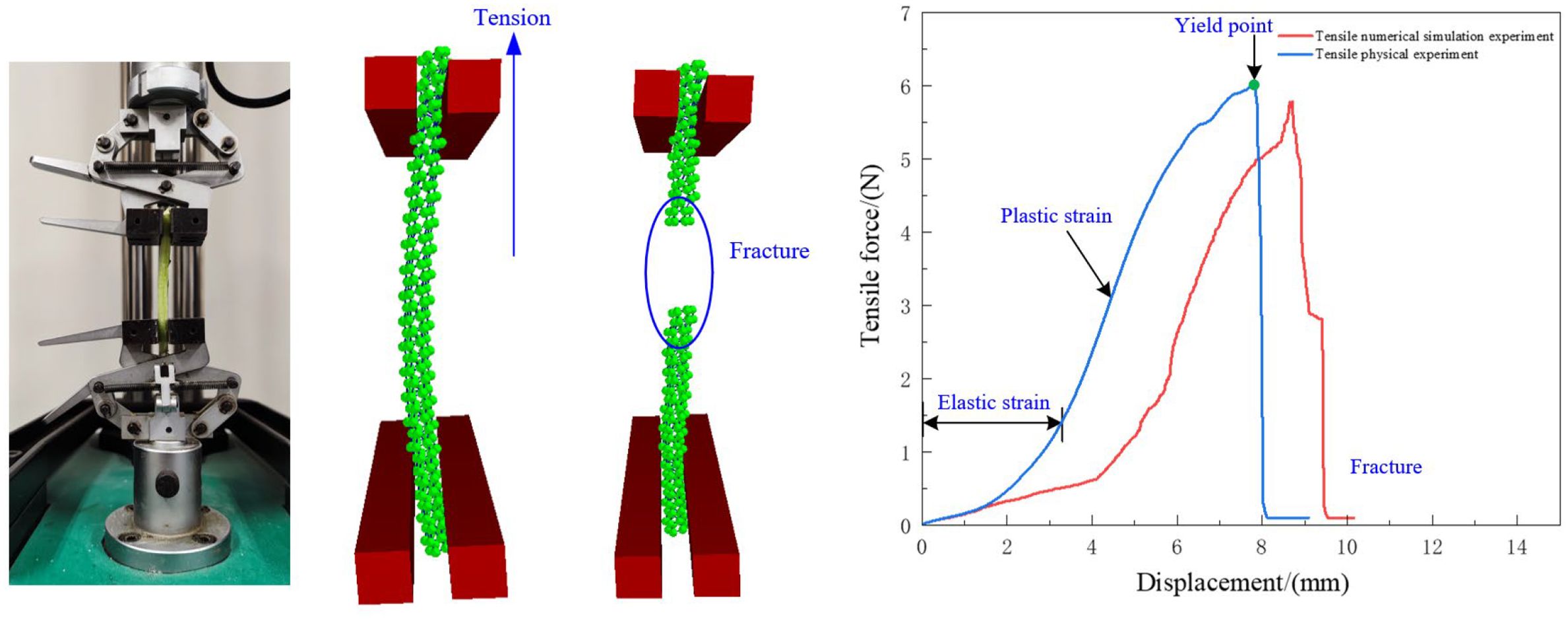 The correlation coefficient Rk indicates the degree of similarity between the two curves: the closer Rk is to 1, the higher the similarity between the curves, suggesting that the simulated tensile force closely matches the actual experimental tensile force. A correlation coefficient close to 0 indicates little to no correlation, while a negative value suggests a negative correlation between the two curves. Based on this method, the calculated correlation coefficient was Rk = 0.97, demonstrating a high degree of consistency between the simulation and experimental curves. This result further validates the accuracy and reliability of the discrete element model developed in this study for describing the tensile behavior of radish petioles.