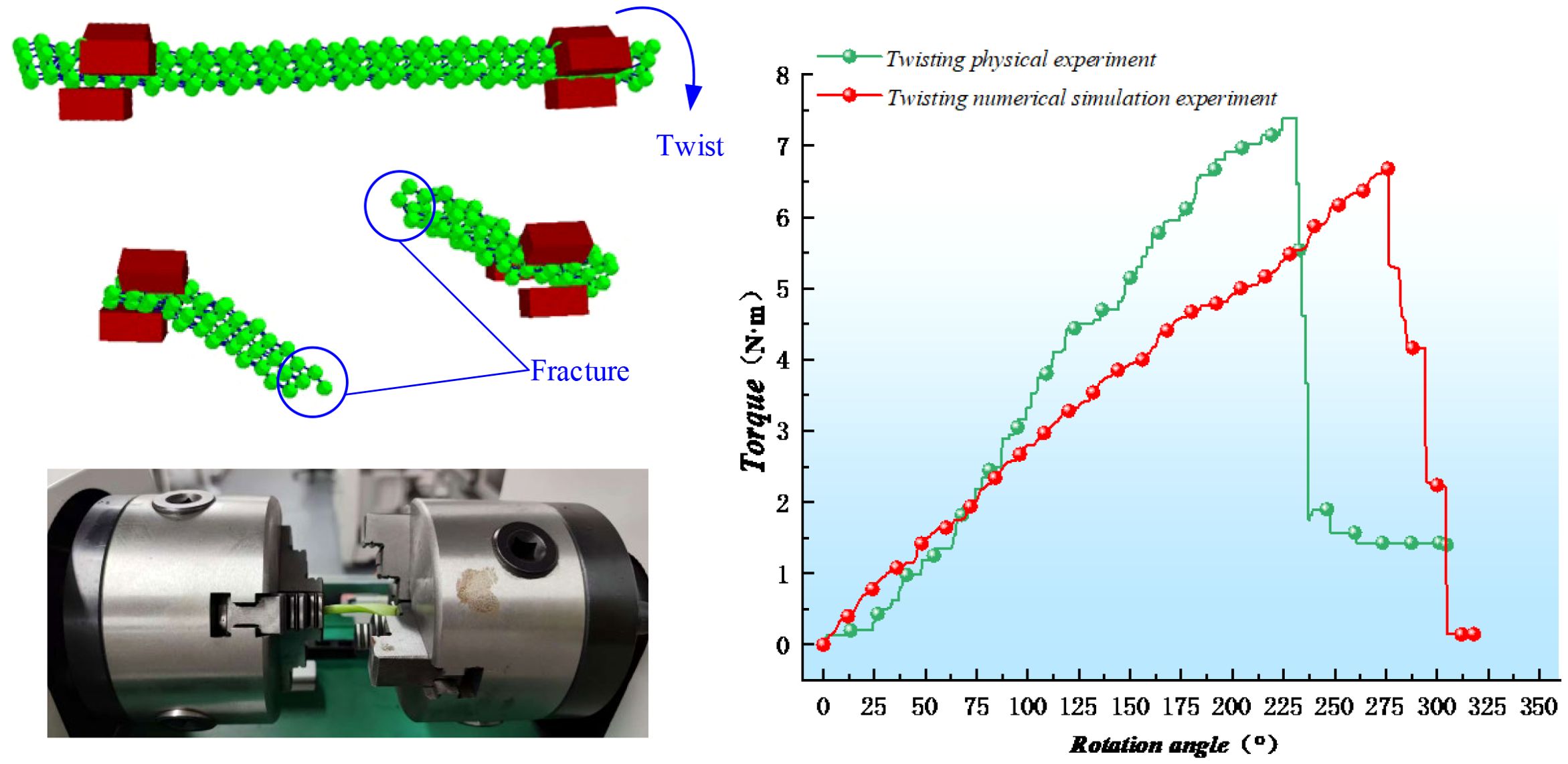 Figure 16 presents the experimental and simulation results for the torsional failure of the radish petiole. Based on the calibrated parameters, the relationship between the petiole’s angle of rotation and torque was recorded in the simulation. Compared with the actual physical experiment, the torsional modulus of the simulated petiole is 1.26 MPa, while the torsional strength at the petiole’s end, as measured in the physical experiment, is 1.34 MPa, with a relative error of 5.97%. This indicates a good fit. The maximum torsional torque obtained from the simulation is 6.73 N·mm, at which point the bonding bond fractures. The maximum torsional force measured in the physical experiment is 7.38 N·mm, with a relative error of 8.8%, which is within an acceptable range.