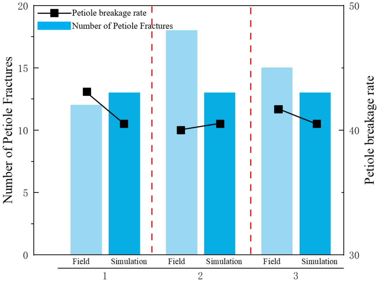 Figure 19 shows the actual field test. As shown in Figure 20, field test results indicate that when the equipment’s forward speed is 0.8 m/s, the working tilt angle is 30°, and the belt rotational linear speed is 0.9 m/s, the measured breakage rate is 41.5%, while the simulated breakage rate is 40.63%, resulting in a relative error of 2.1%. This demonstrates that the calibrated bonding parameters of the radish petiole can effectively characterize the radish discrete element model.