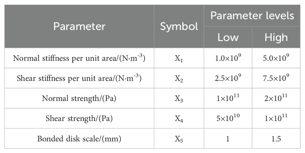 Within the BondingV2 contact model, five key parameters influence the mechanical behavior of the radish petiole, including normal stiffness per unit area, shear stiffness per unit area, normal strength coefficient, shear strength coefficient, and the Bonded Disk Scale parameter. A three-point bending simulation was conducted using the radish petiole model, and the experimental data were processed using Design-Expert 13 software. Five discrete element bonding parameters were selected as experimental factors: normal stiffness per unit area (X1), shear stiffness per unit area (X2), normal strength coefficient (X3), shear strength coefficient (X4), and Bonded Disk Scale (X5). The three-point bending force (Fbe) was used as the response variable to analyze the influence of each factor. A steepest ascent experiment was then performed on the selected significant parameters to approach their optimal value ranges. Subsequently, the optimal contact parameters were determined based on a Plackett–Burman (PB) design. The factor levels used in the experimental design are summarized in Table 3.