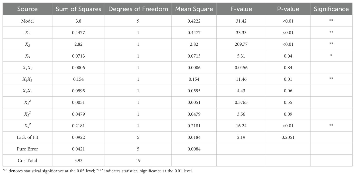 The experimental results were analyzed using variance analysis in Design-Expert software, as shown in Table 8. The P-value for the quadratic regression model of the three-point bending force is less than 0.01, while the P-value for the lack of fit term is 0.22. The model’s coefficient of determination (R²) is 0.97. The regression model is highly significant, the lack of fit term is not significant, and the high R² value indicates that the regression equation for the three-point bending force model fits well. The linear terms for X1, X2, and X5, as well as the interaction term between X1 and X5, and the quadratic term for X5, are all significant, while the remaining terms are not. The regression model for the three-point bending force and the factors is given by Equation 13.