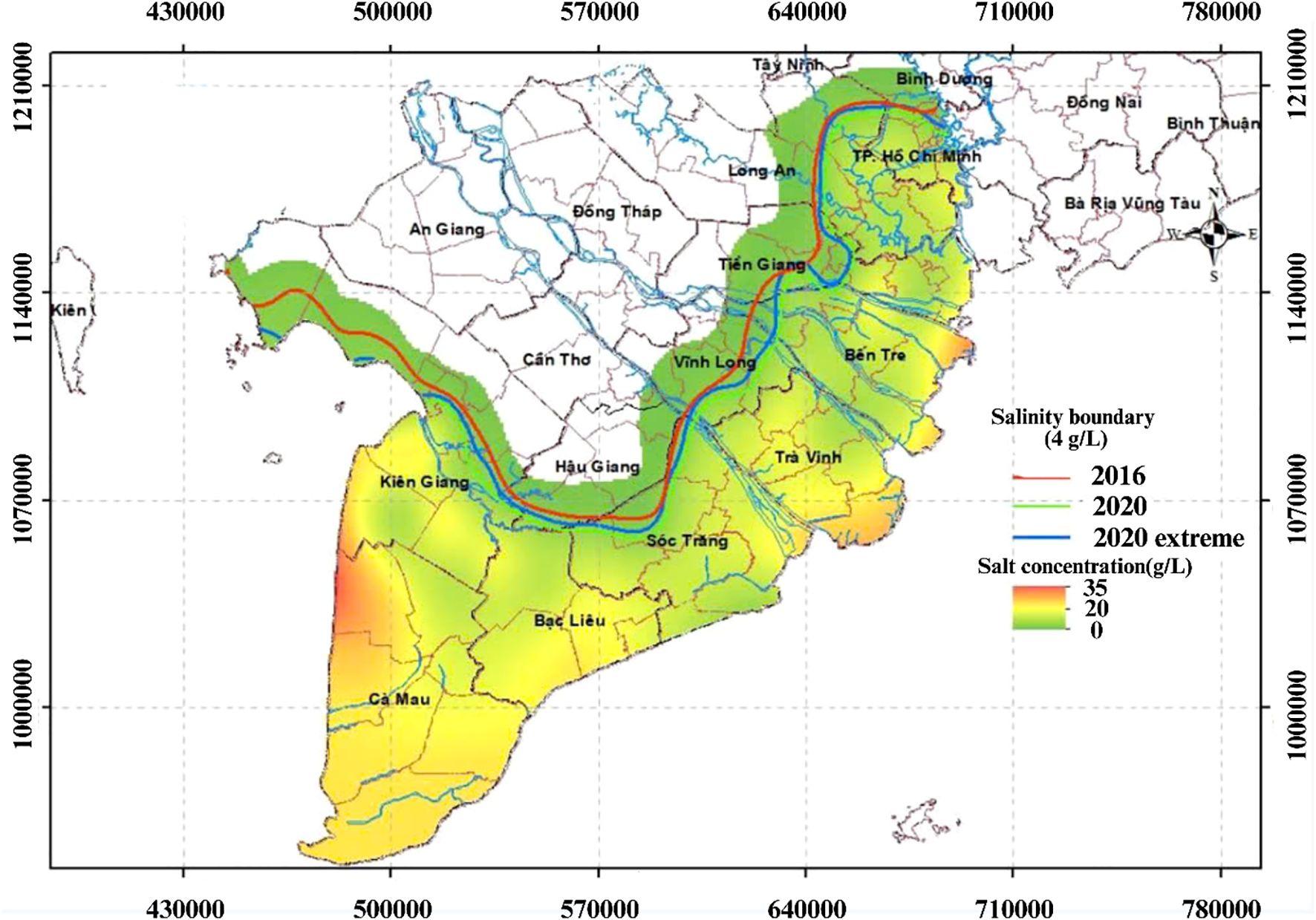 Figure 1. Salinity intrusion in the VMD in 2016 and 2020. Map of salinity intrusion in the Vietnamese Mekong Delta, showing salinity boundaries (4 g L−1) for 2016 (red), 2020 (green), and 2020 extreme scenario (blue), with salt concentration distribution (0–35 g L−1) indicated by a color gradient. The map highlights the spatial extent of saltwater intrusion along major rivers and coastal provinces, reflecting changes over time. Source: (Central Steering Committee for Natural Disaster Prevention and Control (CCNDPC), 2020).