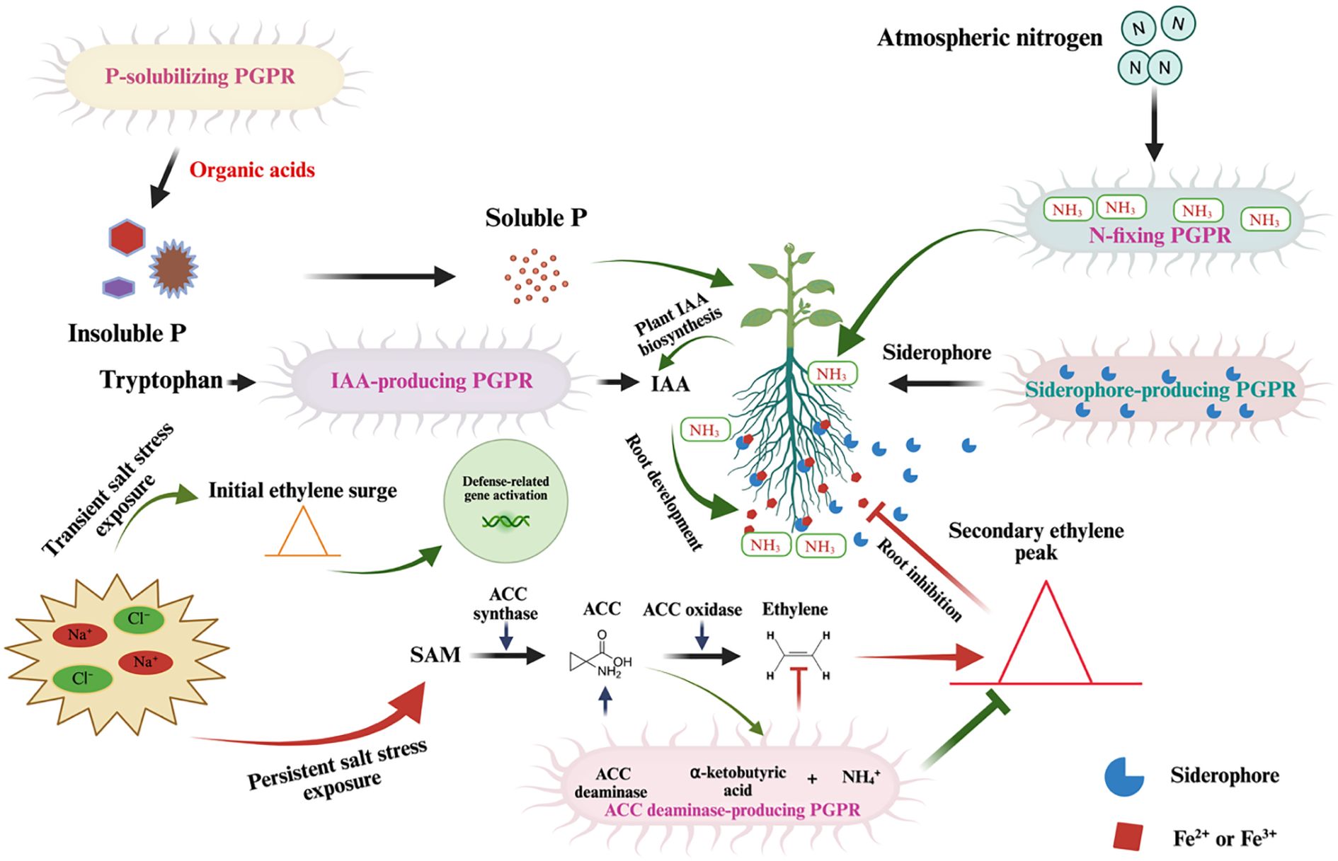 Figure 2. Mechanisms of PGPR in Enhancing Plant Resilience Under Salt Stress. This schematic diagram illustrates the multifaceted roles of PGPR in supporting plant growth under salt stress conditions. (Left Panel): Salt stress, characterized by elevated Na+ and Cl⁻ levels, triggers an ethylene surge via the S-adenosylmethionine (SAM) pathway, involving 1-aminocyclopropane-1-carboxylic acid (ACC) synthase and ACC oxidase. Persistent salt stress leads to an overproduction of ethylene, which inhibits root development, but PGPR mitigate this stress through ACC deaminase activity, reducing ethylene levels. PGPR enhance nutrient availability by solubilizing insoluble phosphorus (P) into soluble P via organic acid production. (Center Panel): PGPR facilitate IAA (indole-3-acetic acid) biosynthesis, promoting root development and nutrient uptake. (Right Panel): Nitrogen-fixing PGPR convert atmospheric nitrogen (N2) into ammonia (NH3), which is further assimilated by the plant. Additionally, siderophores produced by PGPR chelate Fe²+/Fe³+, improving iron availability.