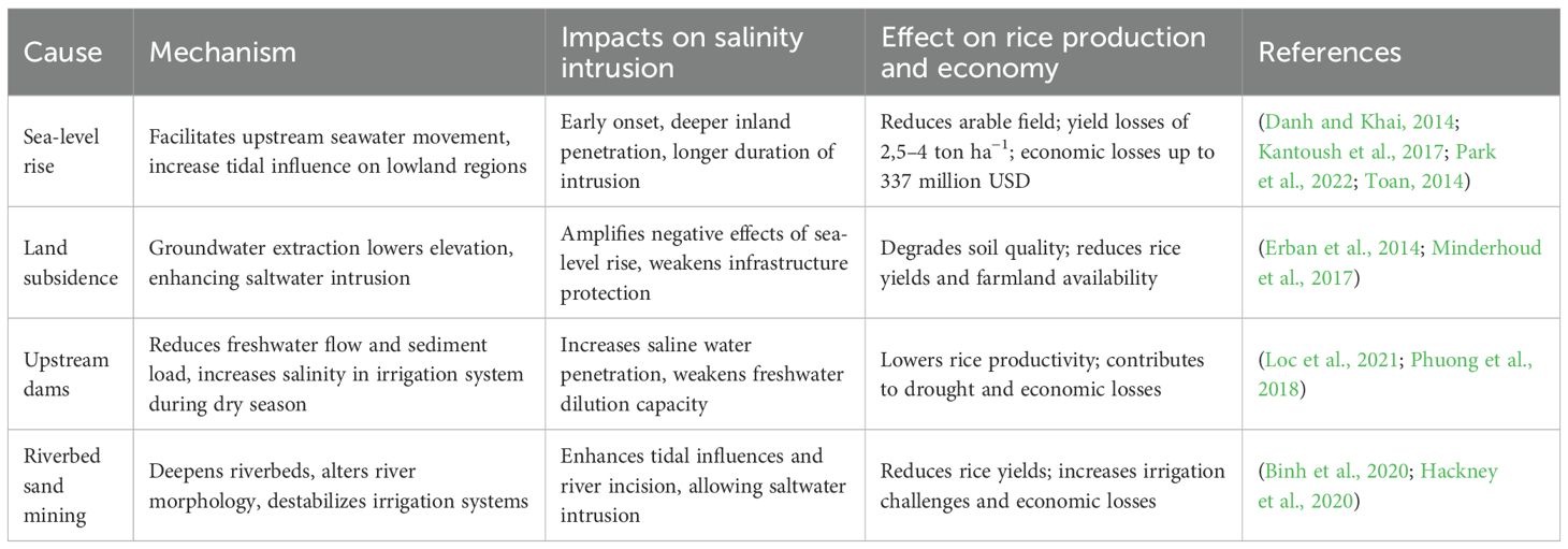 Upstream hydropower dams in the Mekong River Basin significantly alters downstream hydrology by reducing freshwater flow, intensifying salinity intrusion during the dry season. By 2016, 56 dams, including mega-dams Xiaowan and Nuozhadu, disrupt flow patterns, decrease frequency and intensity of seasonal floods, contributing to severe droughts in 2015–2016 and 2019–2020 (Phuong et al., 2018). These upstream dams also trap nutrient-rich sediments, reducing soil fertility and exacerbating salinity destructive impacts (Loc et al., 2021). The limited coordination and collaboration restrict Vietnam to secure sufficient amount of freshwater for irrigation and household consumption, especially during dry season. Furthermore, riverbed sand mining with approximately 8,5–45,7 Mm3 annually causes riverbed incision, pushing seawater intrusion and destabilizing riverbanks (Hackney et al., 2020). Illegal sand mining, a long lasting and unsolvable environmental issue, which is linked to construction demand, magnifies ecological damage, including loss of fish habitats that support rice-based agroecosystems (Park et al., 2020; Yuen et al., 2024) (Park et al., 2020; Yuen et al., 2024). Additionally, land subsidence, which fundamentally caused by excessive extraction of groundwater for domestic, agricultural, and industrial activities, aggravates this fragility. Subsidence rates average around 2,5 cm year−1 and reach 4 cm year−1 in Ca Mau, outpacing global sea-level rise (2,8–3,6 mm year −1). This crucial threat lowers the VMD’s elevation and increases flooding risks in rice field (Minderhoud et al., 2017; Qin et al., 2013). Moreover, over-extraction of groundwater has depleted aquifers, leading to the infiltration of saline water through capillary rise, degrading arable land (Erban et al., 2014).