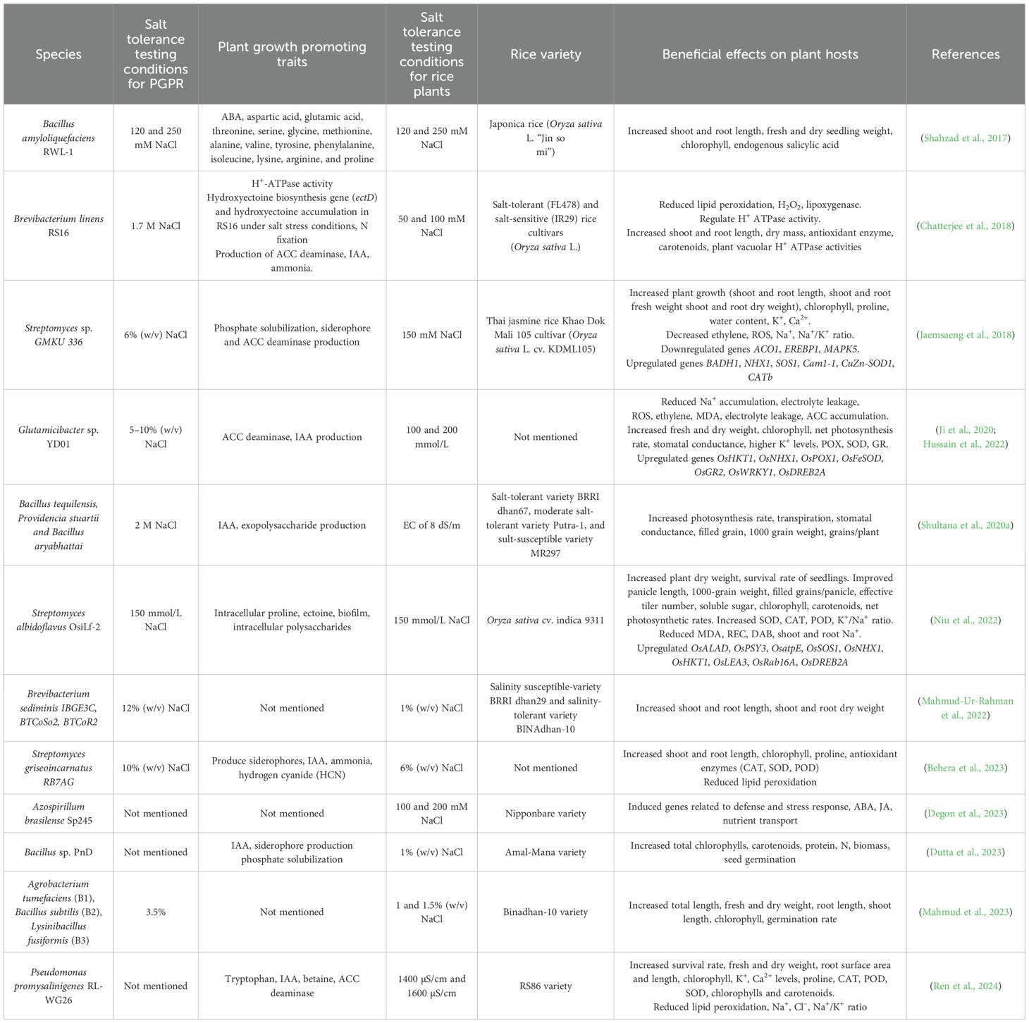 Implementations of PGPR significantly improve rice plants physiologically and morphologically (Figure 2; Table 2). Inoculation with Azospirillum brasilense significantly improves total and root plant mass in rice plants grown under high salt concentrations (100 mM and 200 mM NaCl), with improvements observed seven and fourteen days after treatment (Degon et al., 2023). Bacillus siamensis BW-treated seeds exhibit rapid germination compared to untreated controls and show minimal reduction in shoot and root growth at the early seedling stage under saline conditions (75 mM to 150 mM NaCl) (Oubaha et al., 2024). Similarly, rice plants inoculated with Glutamicibacter sp. YD01 show less reduction in root and shoot length under NaCl stress, as this bacterium promotes root growth in seedlings. Glutamicibacter sp. YD01 also significantly enhances K+, reduces Na+ content in both leaves and roots, and increases relative water content (RWC) in rice seedlings (Ji et al., 2020). A study by Qin et al. (2018) found that Glutamicibacter halophytocola strain KLBMP 5180, isolated from the root tissue of Limonium sinense, significantly promoted host growth under NaCl stress by increasing concentrations of total chlorophyll, proline, antioxidative enzymes, flavonoids, K+, and Ca2+ in L. sinense leaves (Qin et al., 2018). Enterobacter asburiae D2 inoculation specifically promotes rice growth, including root length and dry weight, under both neutral (NaCl) and alkaline (Na2CO3) salt conditions (Ning et al., 2024). Additionally, Pseudomonas promysalinigenes RL-WG26 significantly increases plant biomass, root surface area, and root length in rice seedlings under both normal and saline conditions (Ren et al., 2024).