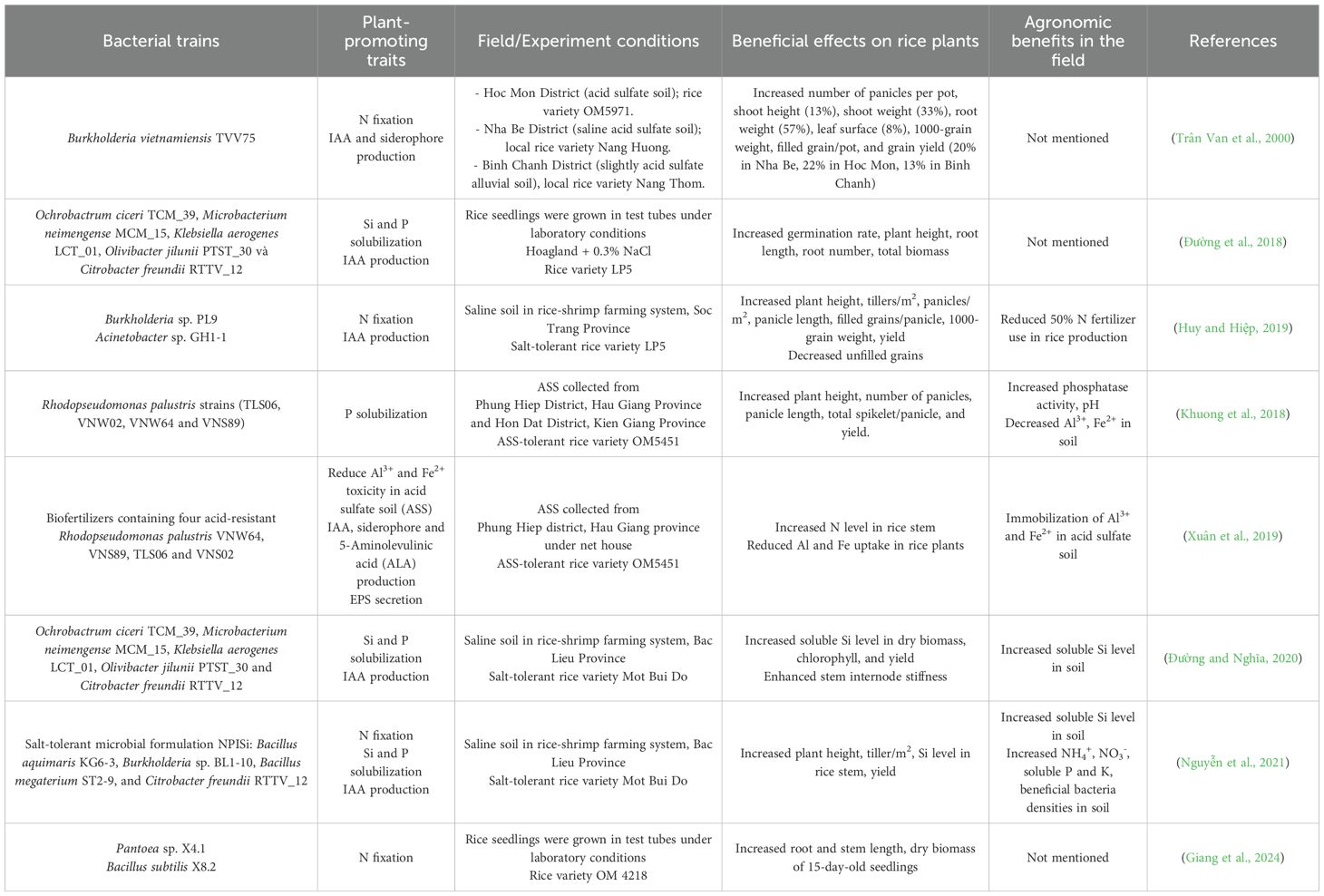 Among various strategies to enhance salt stress tolerance in rice, the implementation of plant growth-promoting rhizobacteria (PGPR) offers an environmentally sustainable and effective approach. However, in Vietnam, research on the effects of PGPR on the rice plant growth, development, nutrient uptake, phosphate (PO43−) and silicate (Si) solubilization, nitrogen (N) fixation, and mitigation of salinity’s adverse impacts remain limited (Habibi et al., 2014; Hussain et al., 2022). By far, finding PGPR-related studies published in Scopus- or ISI-indexed journals is challenging, with few available (Rose et al., 2014; Khuong et al., 2021). Based on our findings, the 15-year study on the biofertilizer BioGro by Nguyen et al. (2017) is the only long-term investigation conducted in Vietnam to date (Nguyen et al., 2017), while most other papers published in Vietnamese-language scientific journals (Đường et al., 2018; Đường and Nghĩa, 2020; Chiêu and Hiệp, 2010; Giang et al., 2024; Huy and Hiệp, 2019). This knowledge gap and limited accessibility hinders advancements in PGPR engineering, commercialization, as well as international collaboration. In this work, we evaluate the current state of saline intrusion in the VMD, highlight salient findings from PGPR studies in Vietnam, and explore the potential use of indigenous strains to enhance rice tolerance to salt stress in Vietnam.