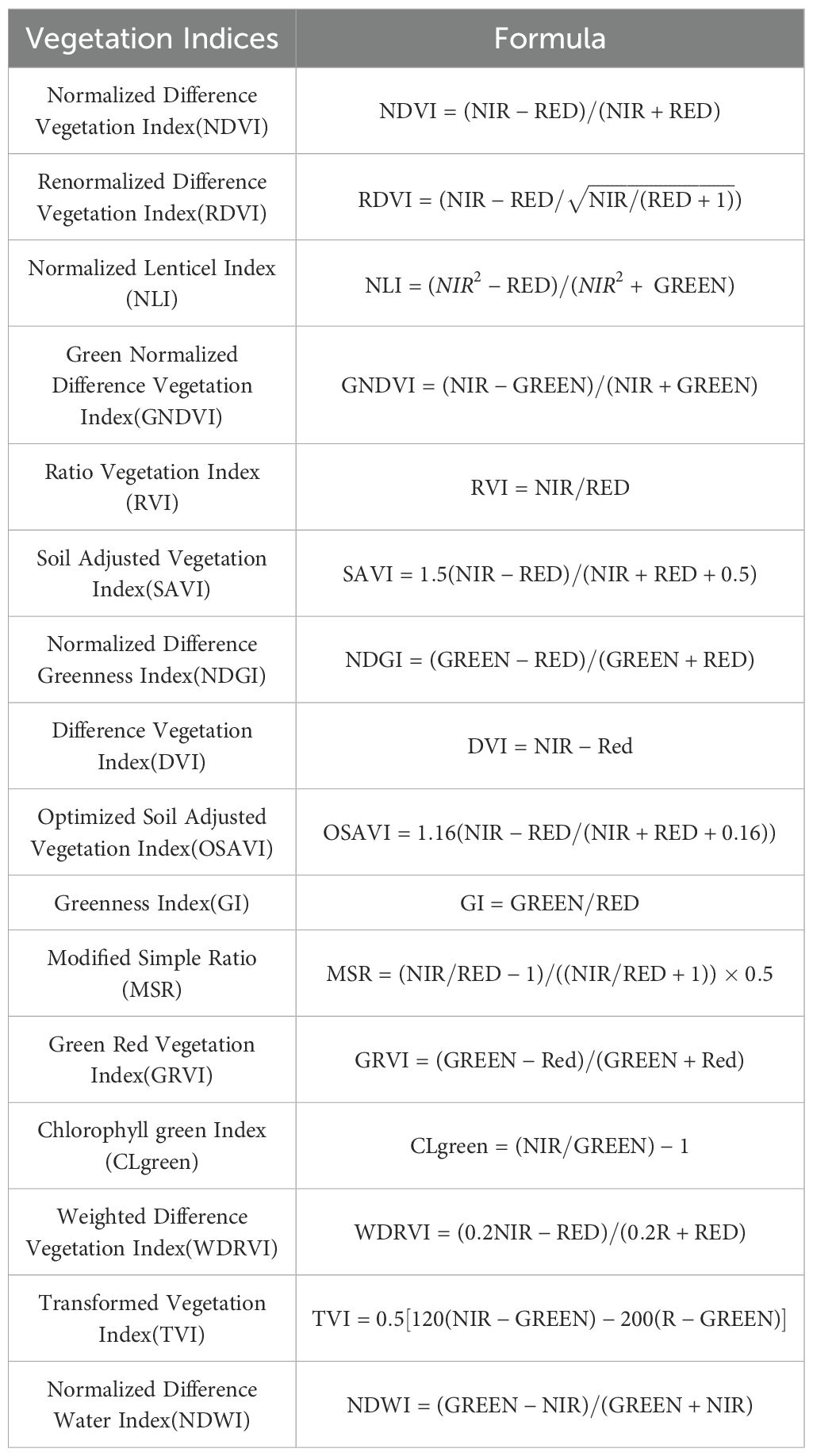 Vegetation indices can indirectly reflect key physiological processes, such as crop photosynthetic efficiency, nitrogen accumulation, and biomass formation, by quantifying canopy spectral characteristics. These parameters exhibit significant synergistic effects with yield components. Considering the varying sensitivity of vegetation indices to specific agronomic traits, this study utilized the UAV’s multispectral sensor channel to establish 16 key vegetation indices (NDVI, RDVI, NLI, GNDVI, RVI, SAVI, NDGI, DVI, OSAVI, GI, MSR, GRVI, CLgreen, WDRVI, TVI, NDWI) (Ke et al., 2015; Naga et al., 2024; Mitra et al., 2025), to identify the optimal yield monitoring metrics, as detailed in Table 1.