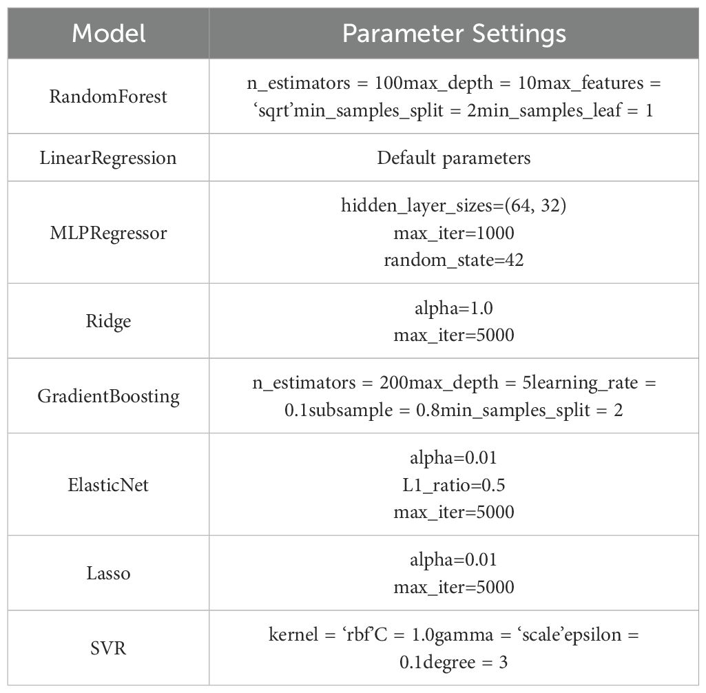 This study systematically constructed eight machine learning regression models for sorghum yield prediction, including lasso regression, ridge regression, elastic net, random forest, multilayer perceptron, support vector regression, gradient boosting tree, and linear model. The dataset was divided into training and test sets with an 8:2 ratio, and hyperparameter optimization was achieved through 5-fold cross-validation and grid search (Table 2). Four spectral bands and 16 yield-related vegetation indices, combined with meteorological data, were selected as input parameters to model and analyze sorghum yield. The model performance evaluation metrics included the coefficient of determination (R2) (Equation 1), root-mean-square error (RMSE) (Equation 2), and mean absolute error (MAE) (Equation 3), providing a comprehensive measure of prediction accuracy and stability.