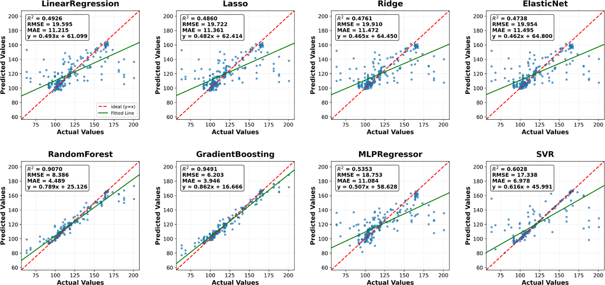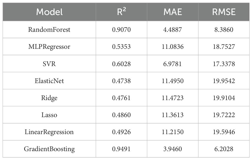 Among all eight models, Gradient Boosting performed the best, with an R² of 0.9491, RMSE of 6.2028, and MAE of 3.9460, indicating the strongest fitting ability and prediction accuracy. Random Forest was the next best, with an R² of 0.9070 (Table 3). Linear models (e.g., Linear Regression, Lasso, Ridge, ElasticNet) demonstrated weaker overall performance, with an R² below 0.80 and larger errors. The prediction results of MLPRegressor and SVR fluctuate more, with lower accuracy than the ensemble method, and some sample points show noticeable deviations (Figure 3). Based on the comprehensive evaluation of R², RMSE, and MAE, the fitting performance was prioritized. The top three models with the best fitting performance were selected to construct a stacked model, which was identified as the optimal solution for sorghum yield prediction (Figure 4).