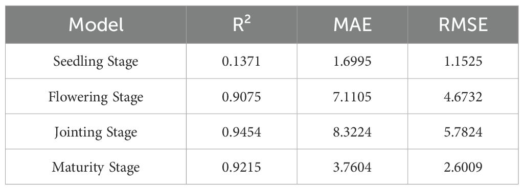To further assess the model’s ability to predict sorghum yield at different fertility stages, the yield prediction results were validated in stages based on seedling emergence, nodulation, flowering, and maturity periods. A comparison of the validation results for sorghum across the four stages of seedling emergence, nodulation, flowering, and maturity revealed significant differences in the contribution of features extracted from each stage to yield prediction. Among these, the features at the jointing stage showed the strongest predictive ability, with generally high model accuracy and a significantly better R² value (R² = 0.9454, Table 4) than the other stages. This indicates that remote sensing and environmental information during this period most effectively reflected the final yield differences; The maturity stage performed next best, also showing a stronger predictive effect; The predictive ability at the seedling emergence and maturity stages was relatively weak, likely due to the plants not being fully developed or stabilized at these stages, which meant that yield differences were not yet fully apparent (Figures 5).