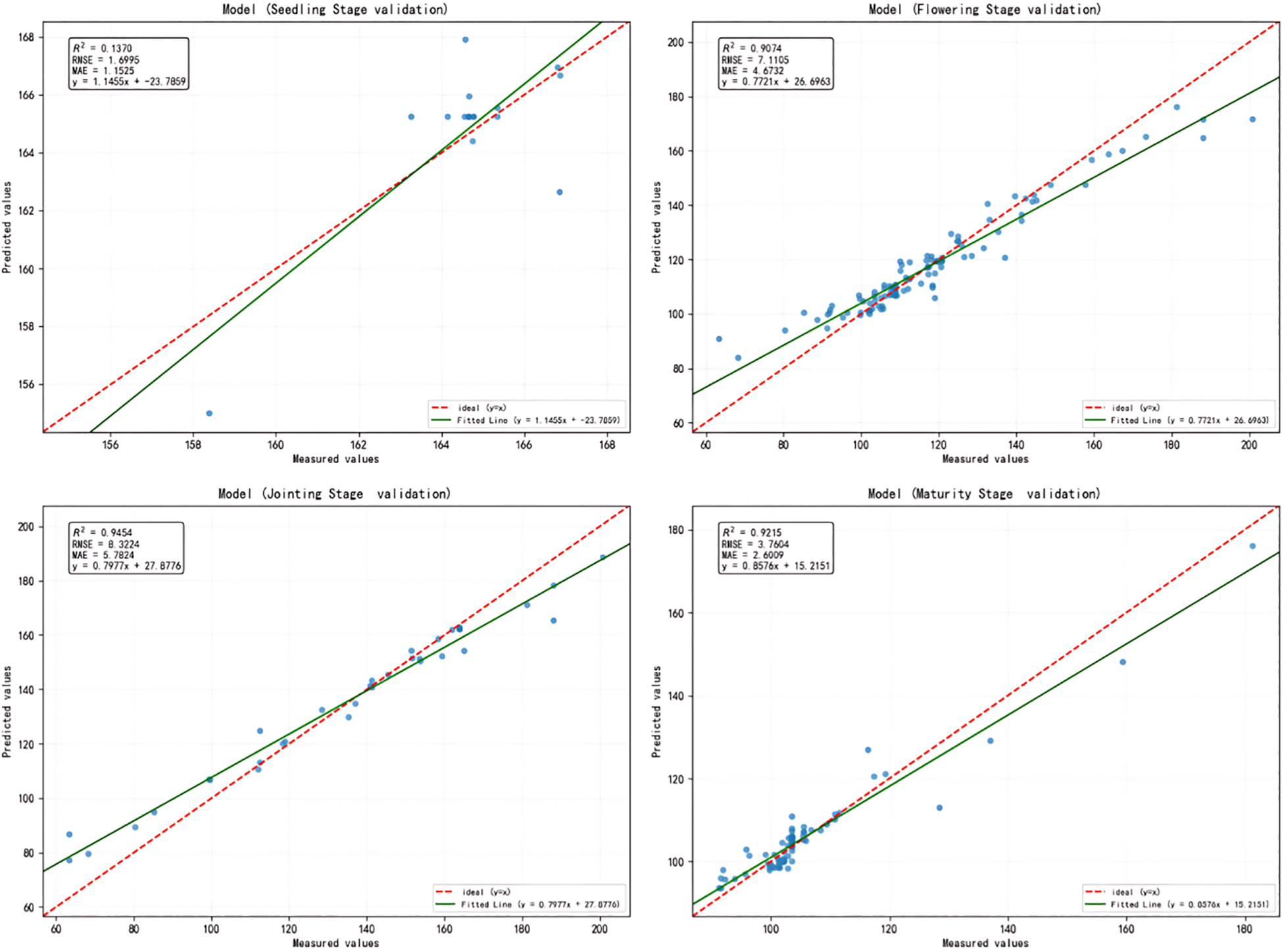 To comprehensively assess the performance of the models in sorghum yield prediction, the test set results were analyzed using three statistical indices: coefficient of determination (R²), root mean square error (RMSE), and mean absolute error(MAE).