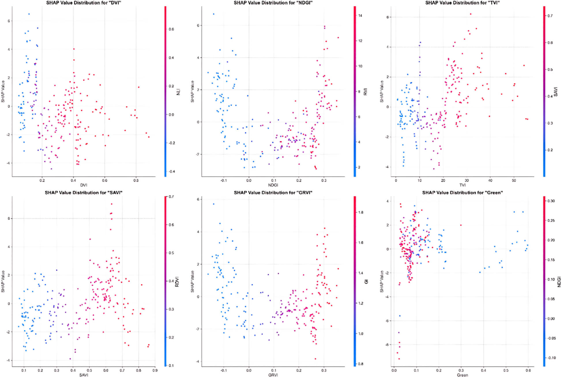 Ensemble learning algorithms performed best, with the Gradient Boosting model achieving an R2 of 0.9491 and Random Forest reaching 0.9070. SHAP analysis revealed that DVI and NDGI were the most important predictors. The jointing stage contributed most to prediction accuracy (R2 = 0.9454), followed by maturity (R² = 0.9215) and flowering (R2 = 0.9075). Yield spatial distribution ranged from 4,291 to 4,965 kg haR-1, with a global Moran’s I index of 0.5552 indicating moderate positive spatial autocorrelation.