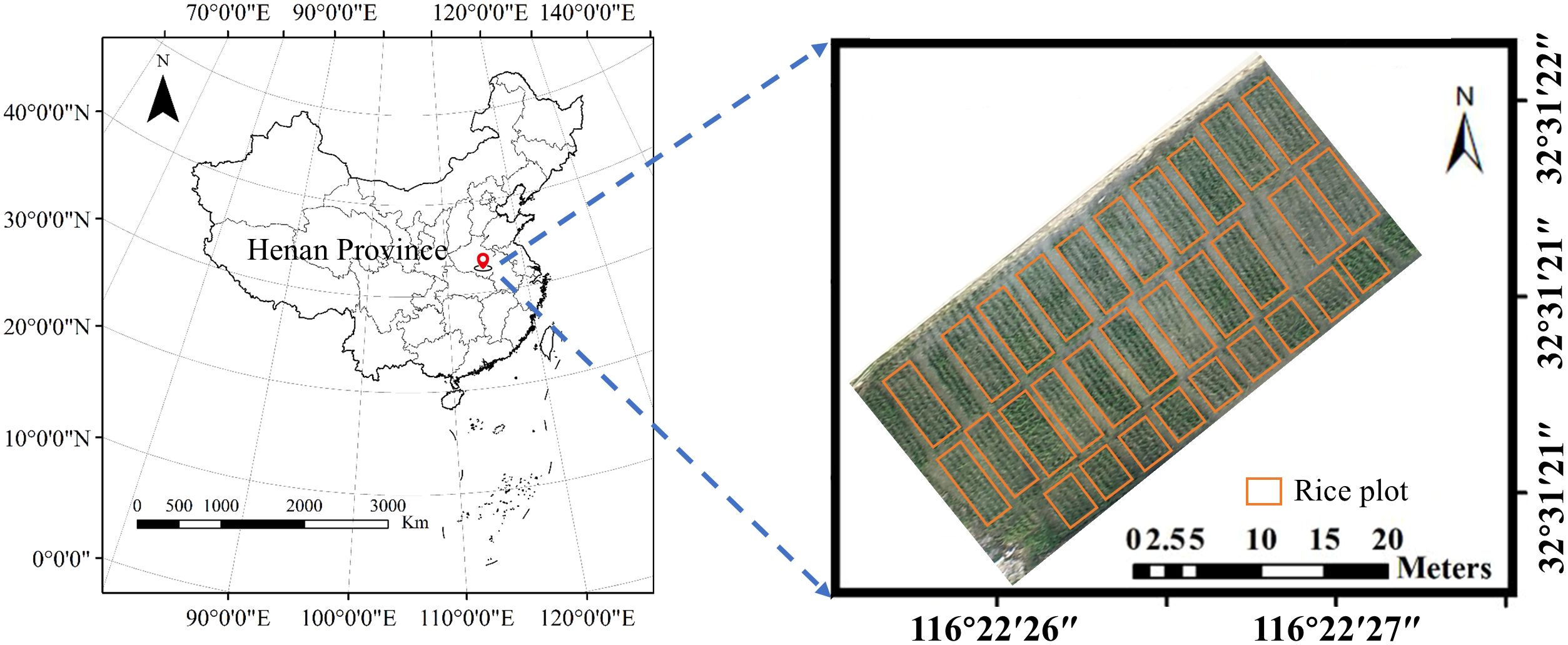 The study utilized 30 rice varieties, with each variety planted in a separate plot, totaling 30 experimental plots under normal field management conditions in Xinyang city, Henan province. All plots received consistent cultivation practices including irrigation, fertilization, and pest control to ensure uniform growing conditions across the study area (as shown in Figure 1). Rice seedlings were sown on May 10, 2024, and transplanted on June 12 at a uniform spacing of 0.25 m × 0.25 m, with a planting density of 25 plants/m².