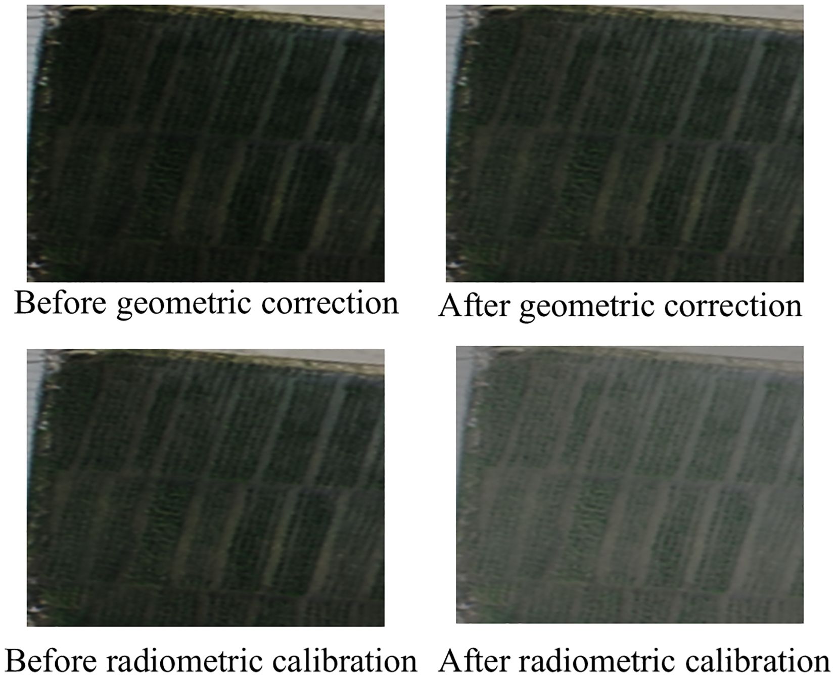 Data processing is a critical step in UAV-based multispectral data analysis, as raw images captured by the RedEdge-P camera require correction and calibration before further use. The initial pixel values lack physical meaning and often contain geometric and radiometric distortions. The processing workflow includes geometric correction, image stitching, and radiometric calibration, all performed using Pix4D Mapper (Pix4D SA, Prilly, Switzerland). First, the raw multispectral images (in .tiff format) were imported into Pix4D for automatic geometric correction and image stitching. The software utilized the embedded GPS/IMU data from the M350 drone and ground control points to align and orthorectify the images, minimizing distortions caused by terrain variations and camera tilt. After processing, the software generated a high-resolution orthomosaic and a digital surface model (DSM). A comparison between pre- and post-geometric correction is illustrated in Figure 2. Before correction, the RGB composite image exhibited noticeable pixel misalignment, with significant distortions and shape deformations that sometimes rendered objects unrecognizable. After geometric correction, the misalignment and distortion were effectively eliminated, resulting in sharper object boundaries and improved overall image clarity. Radiometric calibration was then applied to convert raw digital numbers into reflectance values. This process involved using reference tarps with known reflectance to derive the reflectance of other targets in the scene. Before each flight, three calibration tarps made of polyester fabric with known reflectance values (0.10, 0.30, 0.50) were placed on flat ground for radiometric calibration. The piecewise empirical line (PEL) method was used for calibration (Luo et al., 2022). As shown in Figure 2, a comparison of UAV multispectral images before and after radiometric calibration reveals significant improvements in image quality. Prior to calibration, the RGB composite image appears visibly darker, with low contrast between rice plants and other ground objects. After radiometric calibration, the RGB composite image exhibits enhanced brightness, significantly improving the distinguishability of rice canopies from surrounding features. Additionally, the soil background, field ridges, and pathways become more clearly delineated, resulting in sharper details across the entire image.
