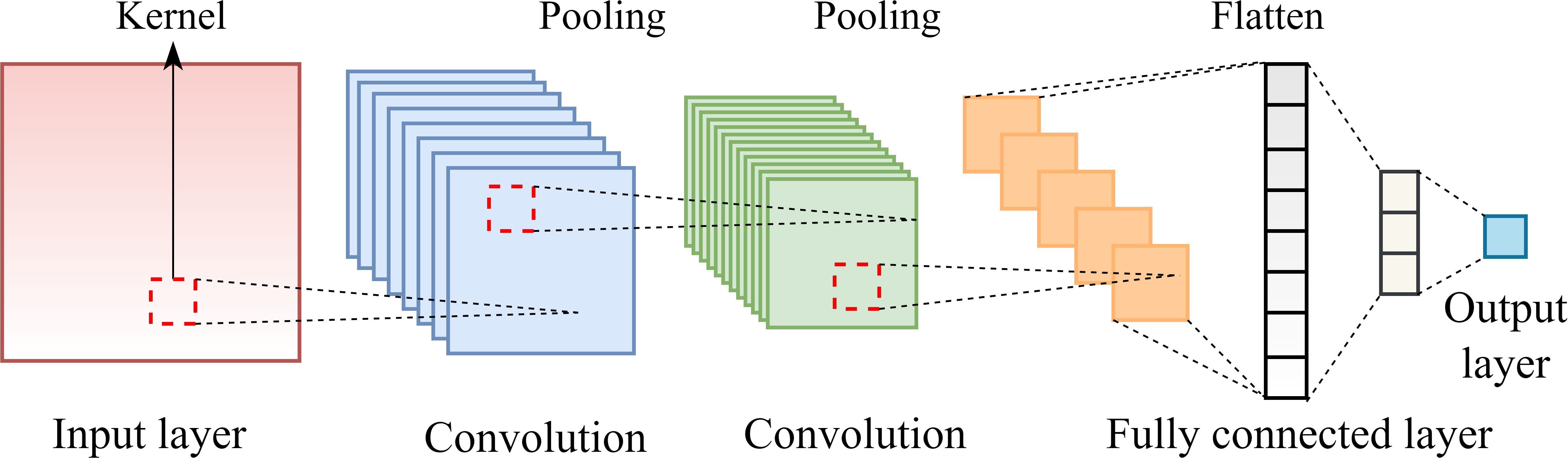 The input layer is responsible for receiving and pre-processing raw data. The convolutional layers usually contain multiple convolutional kernels of varying sizes, each responsible for learning specific patterns from the input. These layers are designed to extract significant information from the original data. Pooling layers perform downsampling on the outputs of convolutional layers, reducing feature dimensionality and network parameters while retaining essential information. The fully connected layers transform the three-dimensional feature maps produced by the pooling layers into a one-dimensional vector, which is then passed to subsequent layers (the output layers).