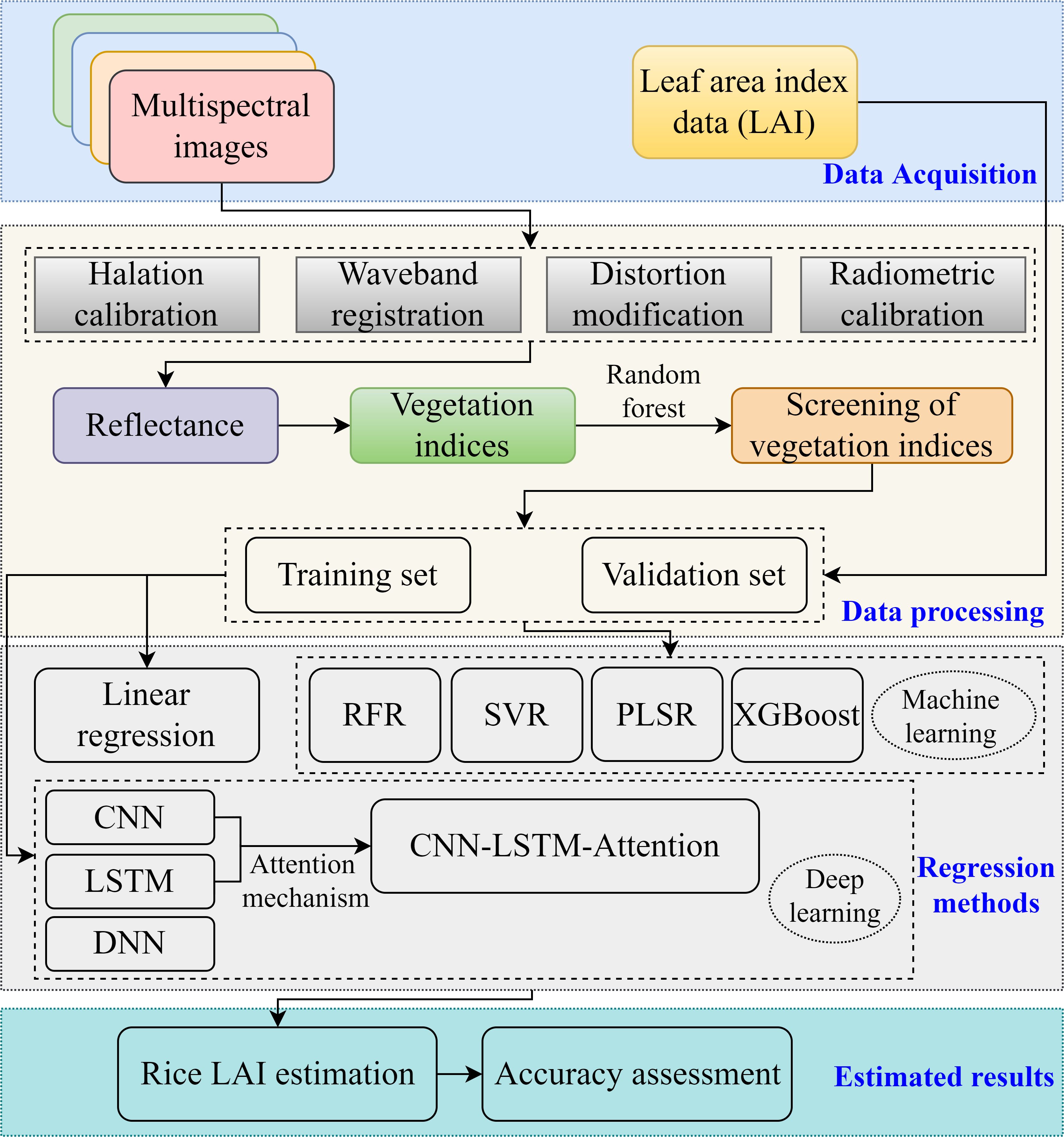Despite these advancements, conventional ML methods face limitations in handling large-scale spatiotemporal data due to their reliance on manual feature engineering and weak temporal modeling capacity. Deep learning, particularly recurrent neural networks (RNNs), has addressed these challenges by automatically extracting hierarchical features from raw data. Long short-term memory (LSTM), a specialized RNN variant, has shown exceptional performance in time-series LAI estimation by capturing long-range dependencies in multitemporal remote sensing data (Liu et al., 2025). However, existing approaches often neglect the dynamic importance of different growth stages, leading to suboptimal performance in full-season LAI estimation. To overcome these limitations, we propose an integrated CNN-LSTM-Attention framework for accurate and adaptive rice LAI estimation across the entire growth cycle. This model synergistically combines: (1) CNN extracts high-level spatial features from multispectral imagery, capturing localized crop canopy structures; (2) LSTM models temporal dependencies in LAI dynamics, accounting for cumulative environmental effects (e.g., temperature, precipitation) on crop growth; and (3) attention mechanism dynamically weights critical growth stages (e.g., tillering, heading) to enhance model interpretability and prediction robustness.