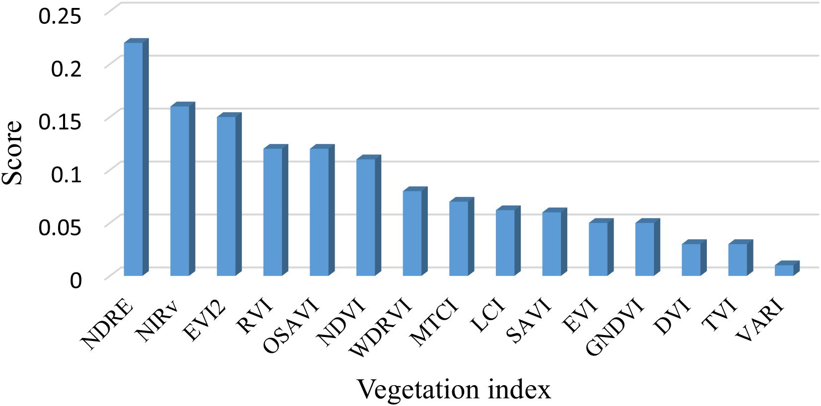 The results of the feature importance scores of the 15 vegetation indices calculated based on the random forest approach are shown in Figure 8. Significant differences in the contribution of each index to the model can be found. Among them, NDRE has the highest importance (more than 0.2), followed by NIRv, EVI2, RVI, OSAVI, and NDVI (more than 0.1), respectively, suggesting that these indices have a greater contribution to the target LAI prediction. The remaining nine vegetation indices have lower importance (all below 0.1) and may have limited enhancement to the model performance. Based on the above analysis, we finally selected the top six vegetation indices that are most important for rice LAI prediction for our analysis.