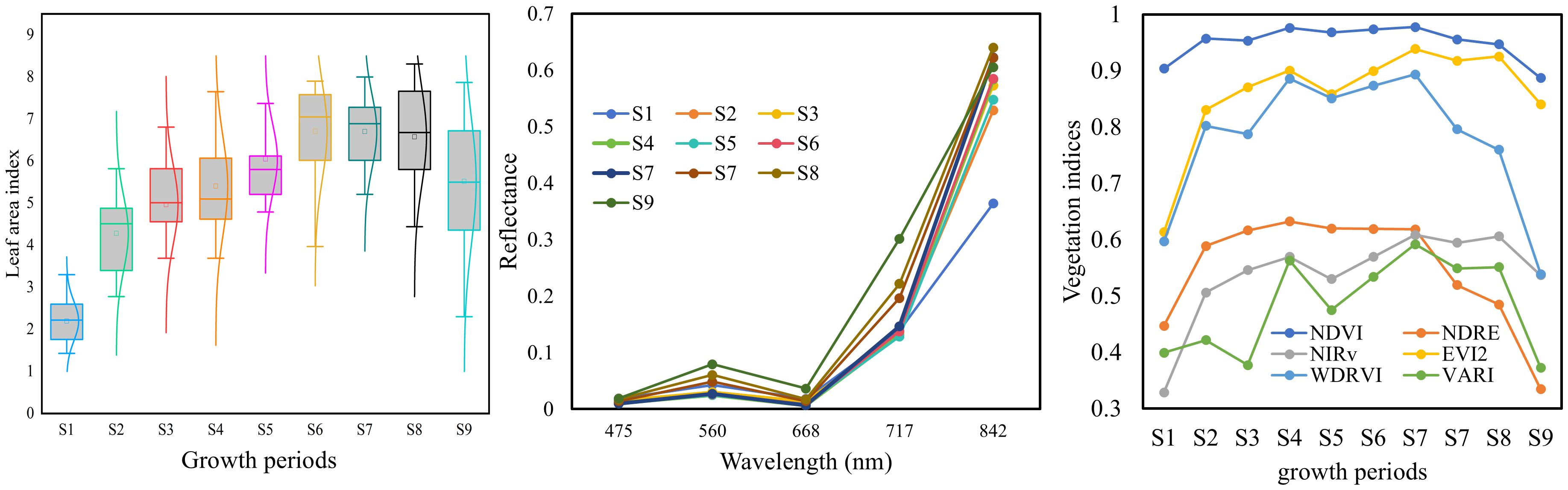 The temporal variation and distribution of rice LAI across ten growth stages are illustrated in Figure 9. Overall, the LAI exhibits a “rise-then-decline” pattern during the rice growing season. This is primarily due to the redistribution of dry matter from vegetative organs (e.g., leaves and stems) to reproductive organs (e.g., panicles) after the booting stage. During the ripening stage, leaf senescence occurs, leading to the gradual yellowing and drying of leaves and consequently a decrease in LAI following its peak (Fang et al., 2014). Taking the case plot shown in Figure 1 as an example, the canopy reflectance at different growth stages is compared in Figure 9. It can be observed that spectral reflectance changes markedly during stages S1 to S3, with only minor fluctuations in subsequent stages. In the near-infrared (NIR) range (842 nm), the reflectance initially increases substantially and then becomes more variable. In the visible band (475-668 nm), the reflectance initially increases substantially and then becomes more variable. In the visible band (490–680 nm), the reflectance generally shows a decreasing trend followed by a slight increase.