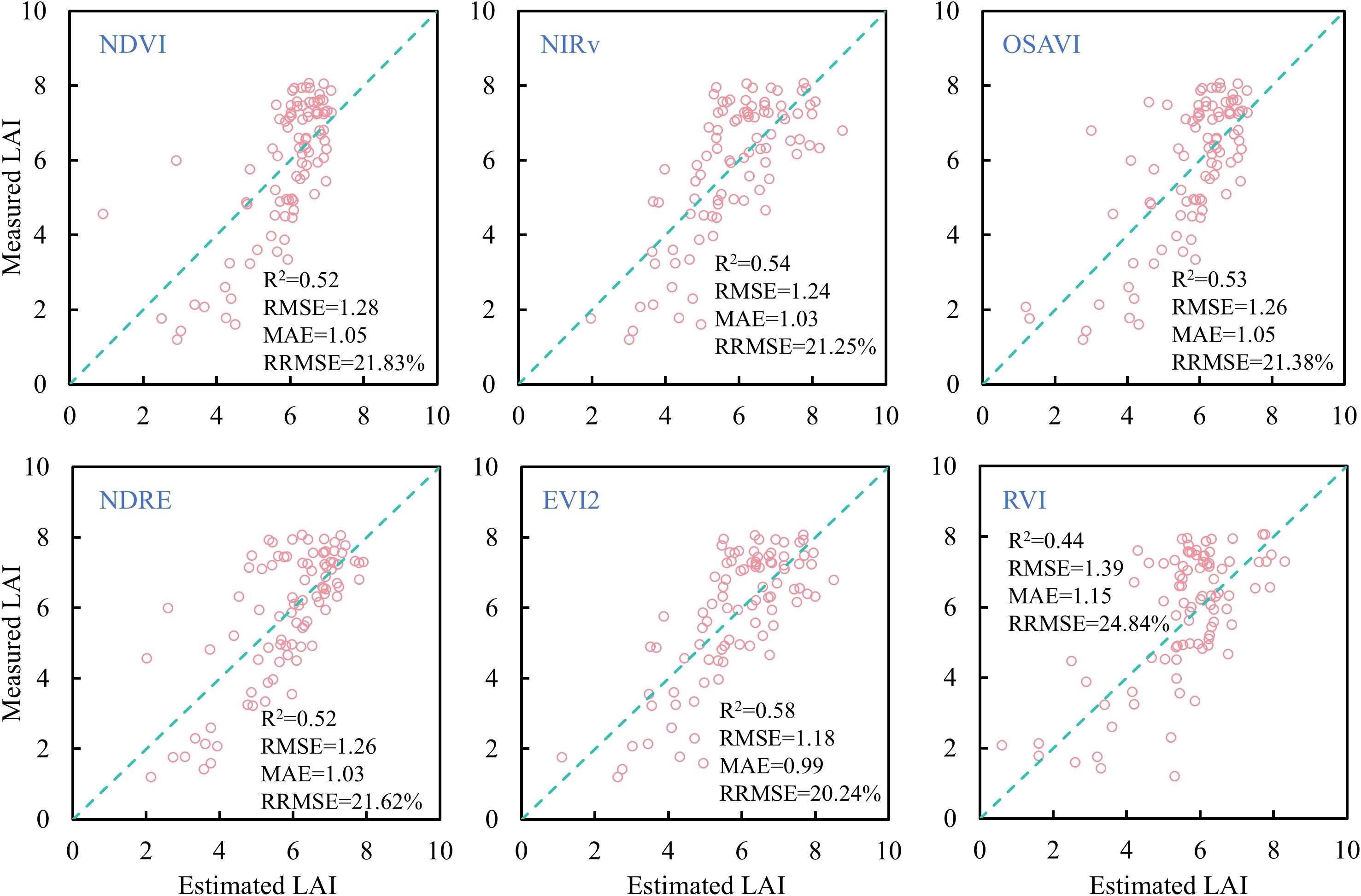 A linear regression model was employed to estimate rice LAI across all growth stages based on individual VIs selected in this study. The results are presented in Figure 10. Except for RVI, the other VIs yielded similar estimation accuracy, with R2 values around 0.52 and RRMSE slightly above 20%. Among these, EVI2 produced the highest estimation accuracy, with R2 = 0.58, RMSE = 1.18, MAE = 0.99, and RRMSE = 20.24%. However, notable deviations from the 1:1 line were observed in the LAI predictions for NDVI and RVI at low LAI values (0-4), and saturation occurred at high LAI values (> 4), where predicted values varied little despite increases in measured LAI. This is because, in the mid-to-late growth stages, canopy closure reduces red band reflectance changes while NIR reflectance remains high, leading to VI saturation (Gu et al., 2013). In contrast, NIRv performed better for high LAI but showed clear underestimation for low LAI values, likely due to soil background influence on NIR reflectance when the canopy is sparse (Darvishzadeh et al., 2008). NDRE demonstrated similar behavior to NIRv, but its estimates at low LAI were slightly more accurate due to its reduced sensitivity to soil background (Deng et al., 2018). Compared to NDVI, NIRv, OSAVI, NDRE, and RVI, EVI2 performed slightly better across both low and high LAI ranges, indicating its potential in reducing background noise and mitigating saturation (Liu et al., 2012). These results suggest that linear regression with single VIs is insufficient for accurately estimating rice LAI across all growth stages.