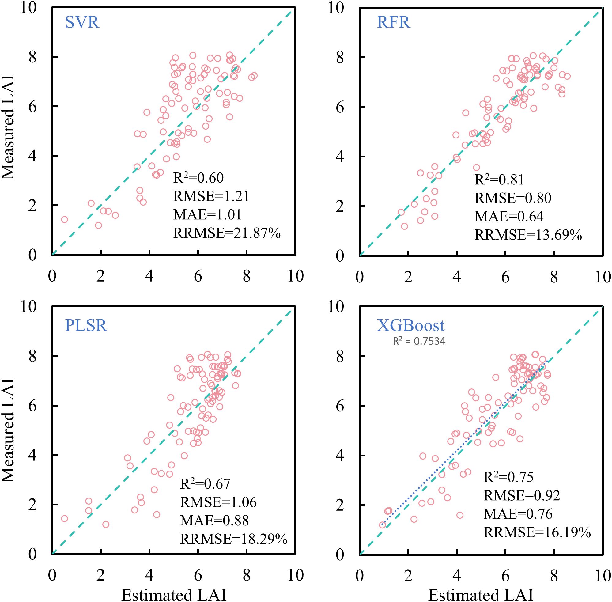 In this study, SVR, RFR, PLSR, and XGBoost were applied to estimate rice LAI across the entire growing season. The results (Figure 11) indicate that, compared with simple linear regression, machine learning algorithms significantly improved estimation accuracy. Among them, SVR and PLSR showed limited improvements, while RFR and XGBoost yielded more notable performance gains. Of the four tested machine learning algorithms, RFR achieved the highest accuracy for full-season LAI estimation (R² = 0.81, RRMSE< 14%), representing an approximate 6% improvement in RRMSE over linear models using individual VIs.