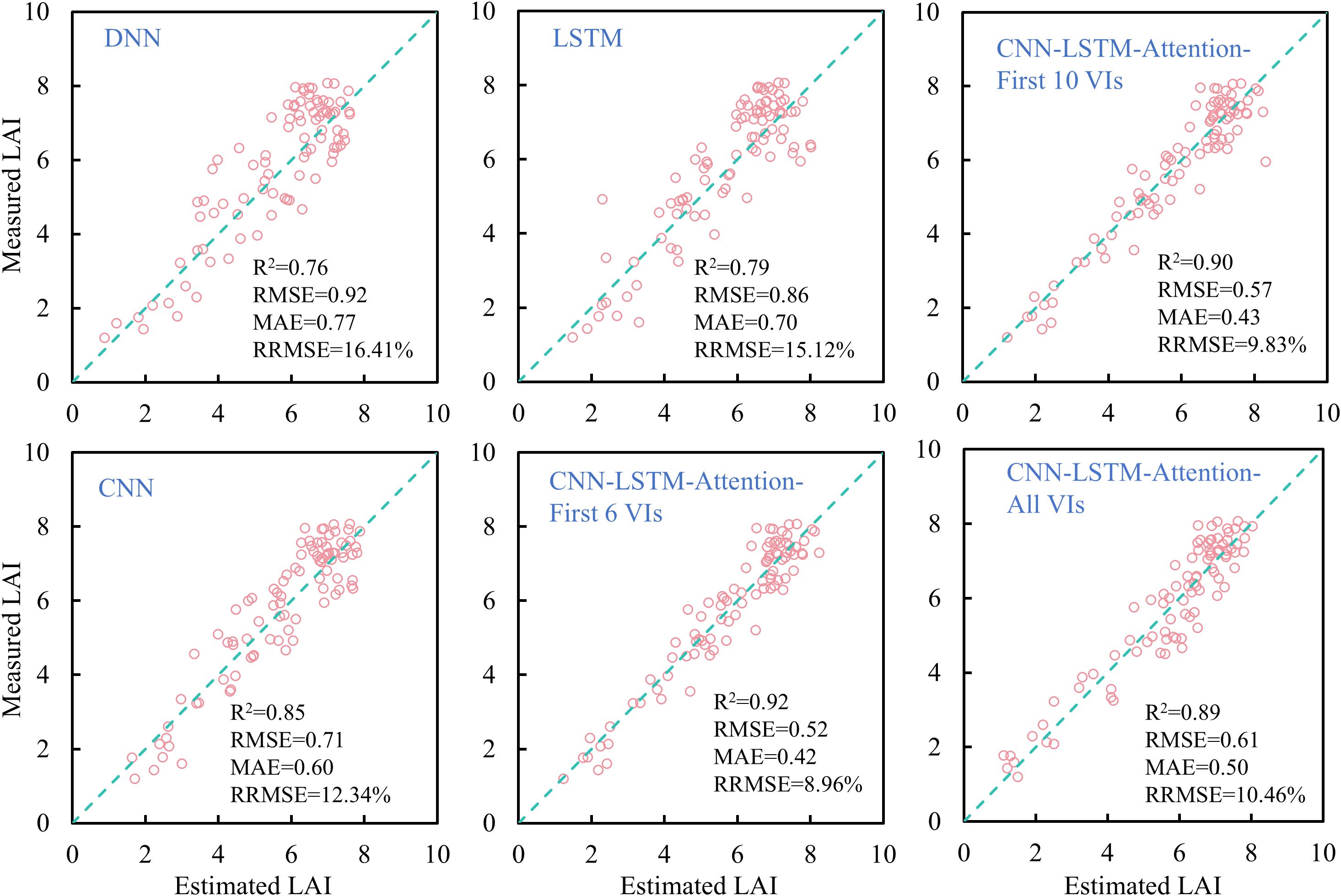 In this study, four deep learning models, DNN, LSTM, CNN, and CLA, were employed to estimate rice LAI across the full growth period. As shown in Figure 12, compared to linear regression and most machine learning models (except RFR), deep learning models substantially improved LAI estimation accuracy. The CLA model achieved the best performance (R² = 0.92, RRMSE< 9%), while other deep learning models exhibited estimation errors above 10%. Notably, not all deep learning models outperformed traditional machine learning: both DNN and LSTM showed lower accuracy than RFR, with estimation errors exceeding 15%, compared to<14% for RFR. CNN yielded higher accuracy than all machine learning models, though lower than CLA. Additionally, deep learning models demonstrated superior performance in estimating both low and high LAI values.