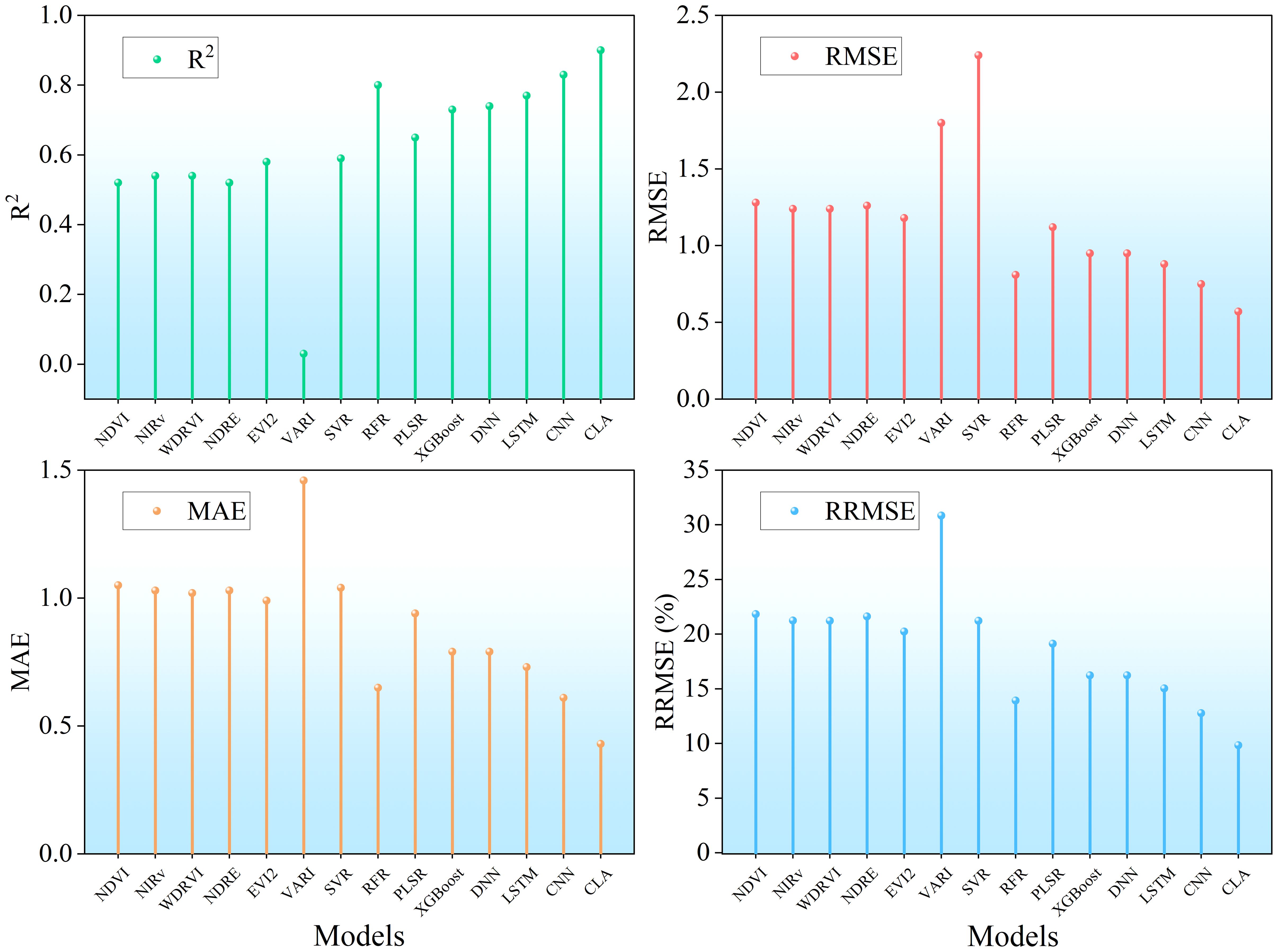 2. Linear regression models based on vegetation indices are limited by soil background effects and saturation issues, yielding relatively low estimation accuracy (R² ≈ 0.5). Although machine learning methods such as RFR show improved performance (R² = 0.81), deep learning models, particularly CLA, demonstrate superior capability in modeling nonlinear relationships and enhancing generalization.