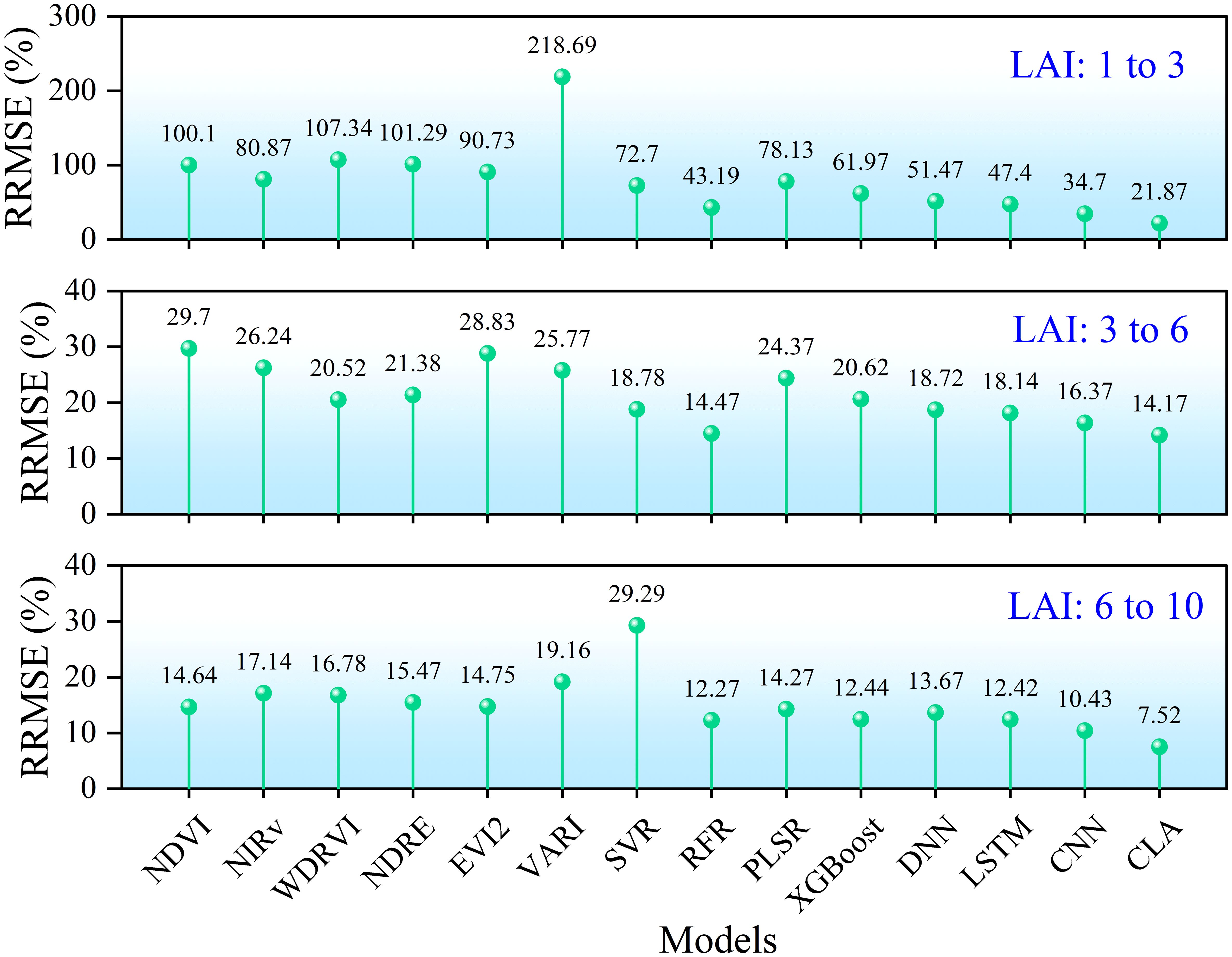 3. The CLA model exhibits robust performance across different LAI ranges. Notably, it achieves the lowest estimation error (~20%) in the low LAI range (1-3), effectively addressing the challenges faced by traditional approaches during early growth stages and in dense canopy conditions.