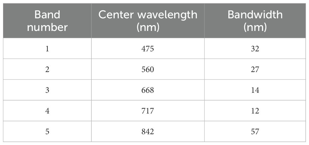 In this study, an octocopter UAV was utilized to carry a multispectral camera (RedEdge-P), which was composed of 5 individual miniature cameras. Each camera was equipped with different filter sizes to obtain the radiation information in the desired wavelength band, and the corresponding center wavelengths and band widths of the 5 cameras are shown in Table 1. The selected bands span the visible to near-infrared regions (Kimes et al., 1981), including red-edge bands known for their utility in crop surveillance (Schlemmer et al., 2013; Clevers and Gitelson, 2013). Flights were executed between 10:00 a.m. and 2:00 p.m. under clear sky and no wind conditions, with a flight altitude of 40 m. All UAV flights were conducted under strictly controlled environmental conditions to ensure data quality. Single UAV flights were limited to three minutes to ensure that light variations were minimal. The UAV shootings produced images with a resolution of 1456×1088 pixels and a ground sampling distance of 2.6 cm/pixel.
