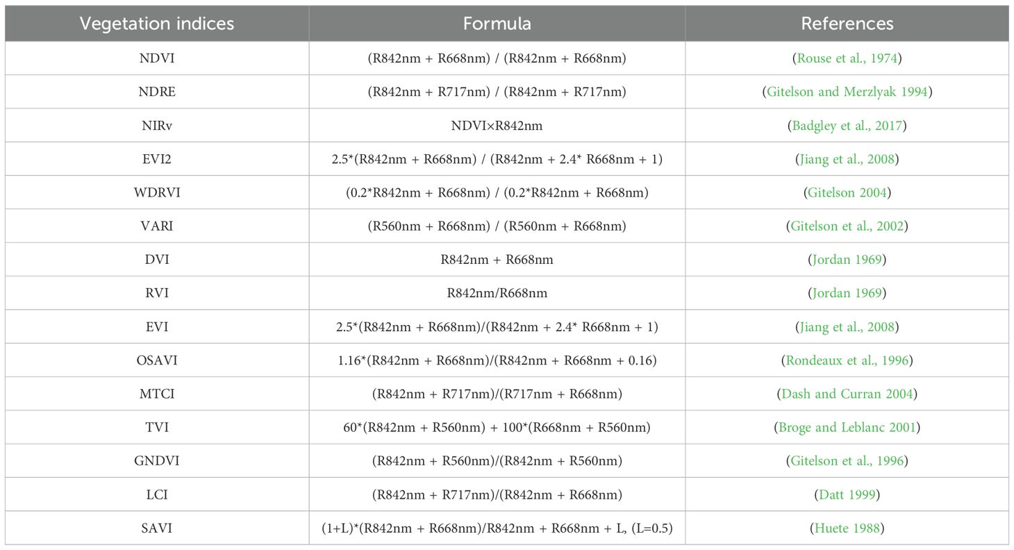Vegetation indices, computed from combinations of spectral bands, are widely used to enhance crop canopy signals, which have been proved to be effective in LAI estimation. Indices such as NDVI, SAVI, EVI2 have showed excellent results in LAI inversion (Han et al., 2021). Lately, red-edge-based indices such as NDRE (Gitelson and Merzlyak, 1994) and CIred edge (Gitelson et al., 2003) have gained attention for their superior performance, particularly when there is a thick cover (Delegido et al., 2013; Deng et al., 2018; Wang et al., 2022). Based on the above prior knowledge, fifteen vegetation indices as shown in Table 2 were considered and selected for this study. Since these VIs have been demonstrated to exhibit superior performance in crop growth monitoring, after the importance ranking analysis, we incorporated several important VIs for rice LAI estimation as input variables during model construction.