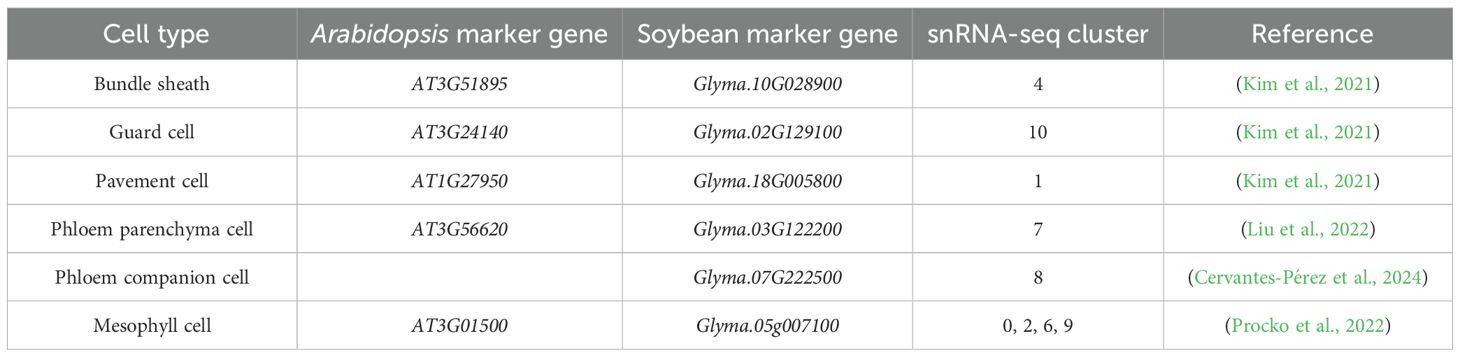 Pathogen infection in plants often results in heterogeneous responses among different host cells in the infected organ, as characterized in previous single-cell transcriptomic studies focusing on plant-pathogen interactions (Cao et al., 2023; Delannoy et al., 2023; Tang et al., 2023; Nobori et al., 2025; Yan et al., 2025). Single-cell/nuclei RNA-seq provides unique opportunities to identify different cell types and even different cell states in the host plant in response to pathogen infection (Zhu et al., 2023b). To elucidate the differential transcriptomic responses among various soybean cell types/states during ASR infection, we performed clustering of all nuclei assayed by snRNA-seq and identified 12 distinct clusters, labeled from cluster 0 to 11 (Supplementary Figure S2A). It is known in the literature that soybean homologs of cell type marker genes from other plant species often exhibit conserved expression in the same soybean cell types (Cervantes-Pérez et al., 2024). Therefore, to annotate the nuclei clusters in our snRNA-seq data, we searched the literature and the Single Cell Plant Database (scPlantDB) for known leaf cell type marker genes in soybean and other plant species and checked the expression of these marker genes or their soybean homologs in our clusters (He et al., 2024). Based on these known leaf cell type marker genes, we annotated a majority of the clusters in our snRNA-seq data: clusters 0, 2, 6, and 9 as mesophyll cells; cluster 1 as pavement cells; cluster 4 as bundle sheath cells; cluster 7 as phloem parenchyma cells; cluster 8 as phloem companion cells; and cluster 10 as guard cells (Table 1, Figure 2A).