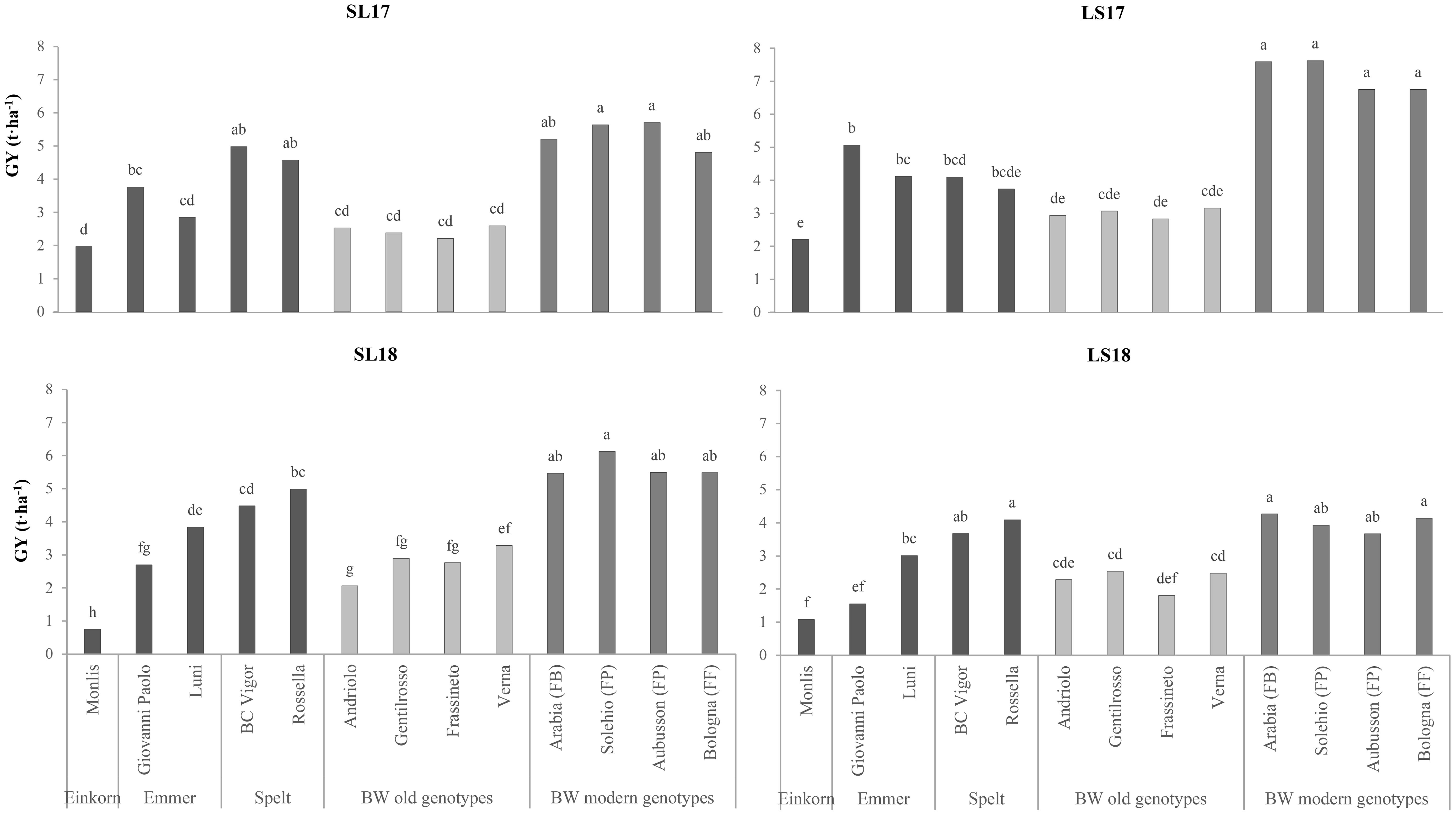 Bar charts titled SL17, LS17, SL18, LS18 show grain yield (GY) in tons per hectare for various genotypes. Each chart compares different genotypes grouped as BW modern and old genotypes, spelt, emmer, and einkorn. Yield differences are indicated with letter annotations, suggesting statistical significance.