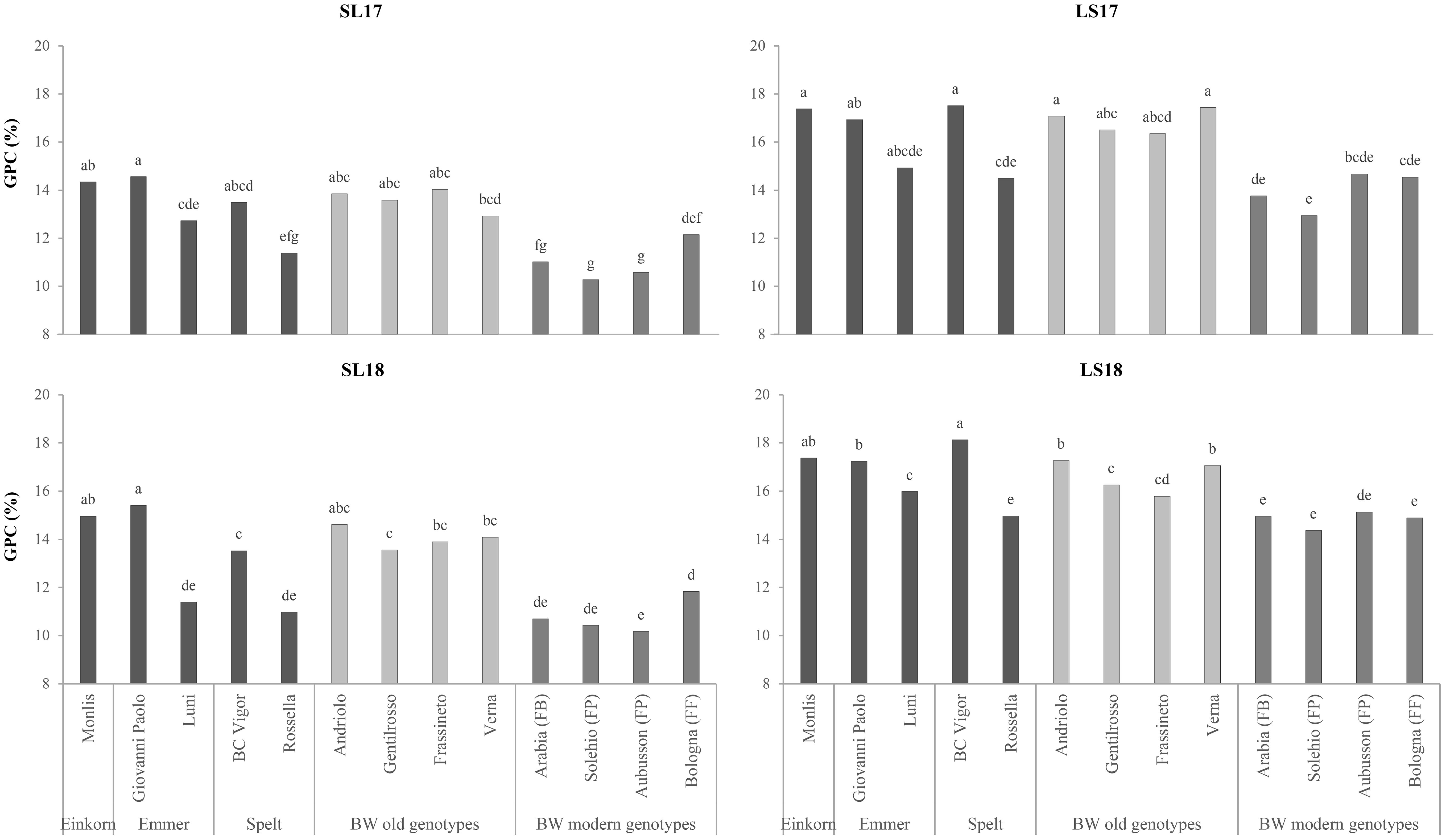 Figure 2. Comparison of the grain protein contents (GPCs) of the investigated genotypes across the growing environments. SL17, sandy-loam soil, harvested in 2017; LS17, loam-silty soil, harvested in 2017; SL18, sandy-loam soil, harvested in 2018; LS18, loam-silty soil, harvested in 2018; BW, bread wheat; FB, wheat for biscuits (frumento biscottiero); FP, ordinary bread-making wheat (frumento panificabile); FF, improver high-protein wheat (frumento di forza). Different letters above the columns indicate significant differences between the groups for p (F) < 0.05 according to the REGW-F test.