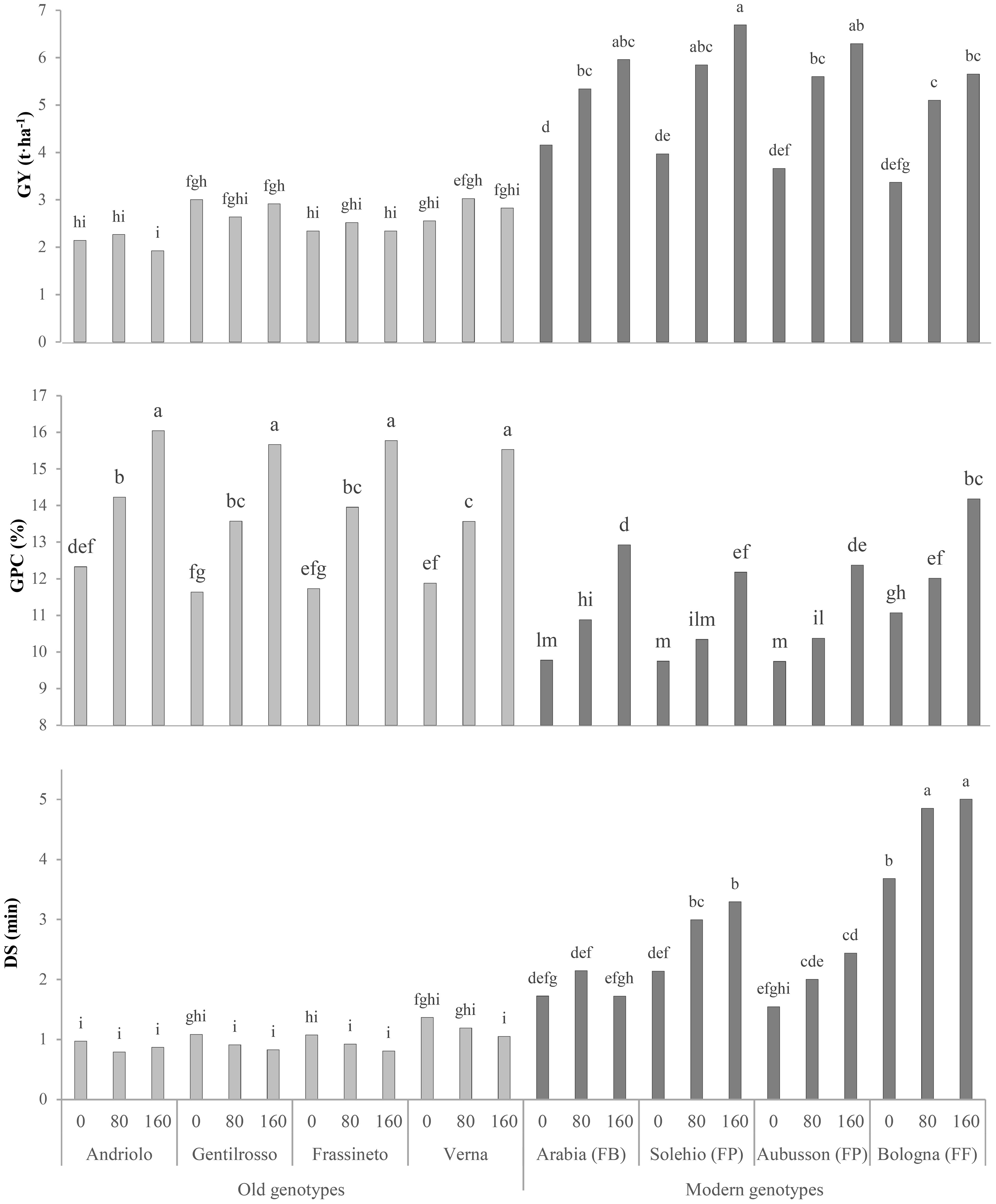 Figure 3. Comparison of the grain yields (GYs), grain protein contents (GPCs), and dough stability (DS) of the investigated bread wheat genotypes cultivated in the Cigliano experimental area and supplied at three different soil N rates (0, 80, and 160 kg N ha−1). FB, wheat for biscuits (frumento biscottiero); FP, ordinary bread-making wheat (frumento panificabile); FF, improver high-protein wheat (frumento di forza). Data are the average of 2 years. Different letters above the columns indicate significant differences between the groups for p (F) < 0.05 according to the REGW-F test.