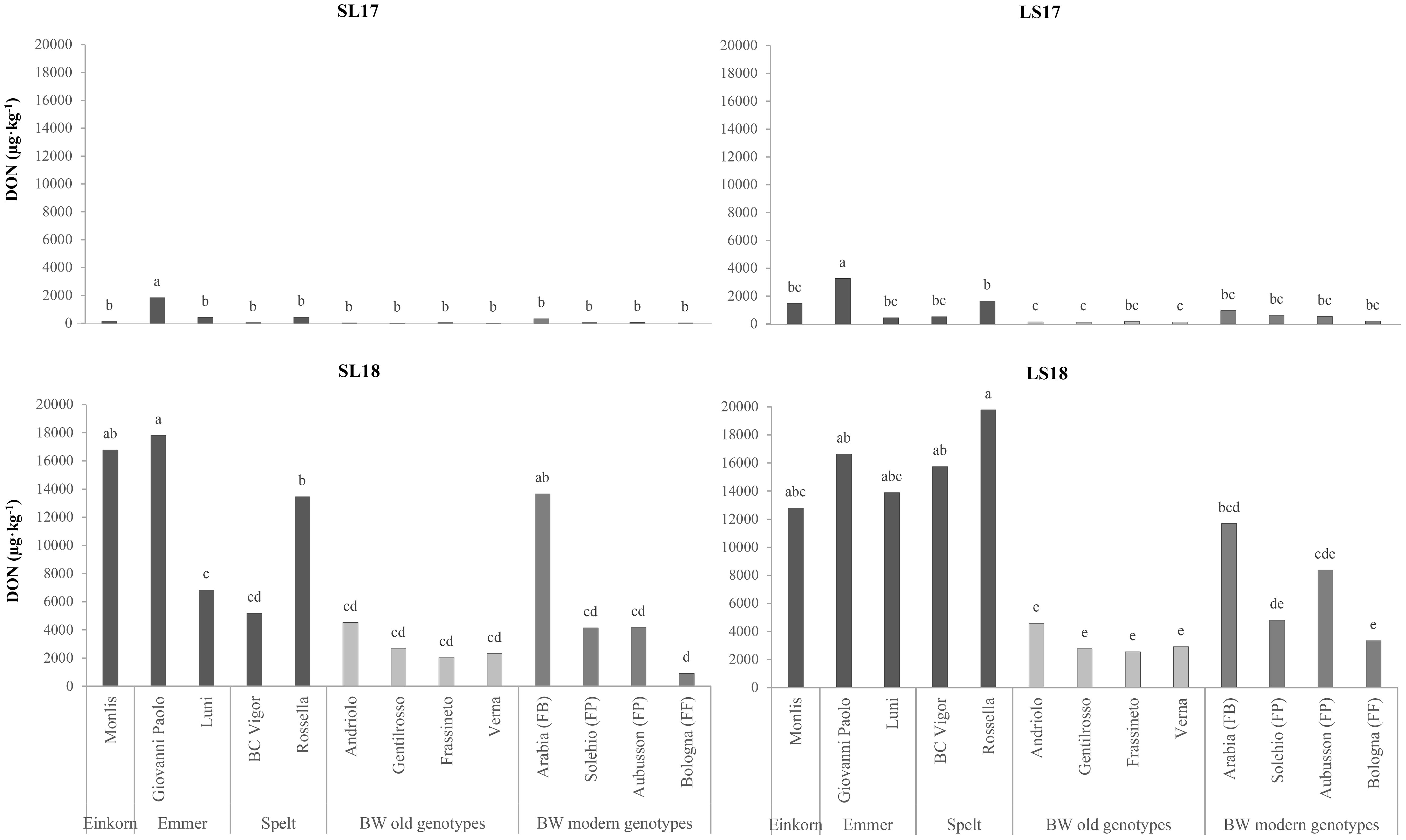 Figure 4. Comparison of the deoxynivalenol (DON) contents of the investigated genotypes across the growing environments. SL17, sandy-loam soil, harvested in 2017; LS17, loam-silty soil, harvested in 2017; SL18, sandy-loam soil, harvested in 2018; LS18, loam-silty soil, harvested in 2018; BW, bread wheat; FB, wheat for biscuits (frumento biscottiero); FP, ordinary bread-making wheat (frumento panificabile); FF, improver high-protein wheat (frumento di forza). The results are expressed on a dry weight (DW) basis. Different letters above the columns indicate significant differences between the groups for p (F) < 0.05 according to the REGW-F test.